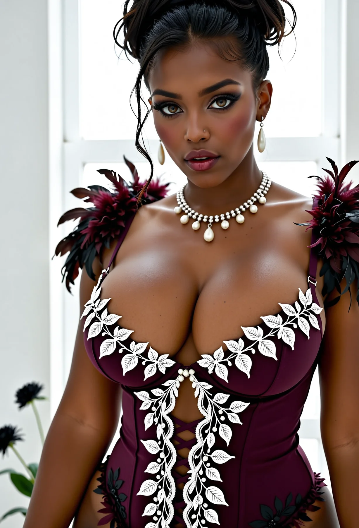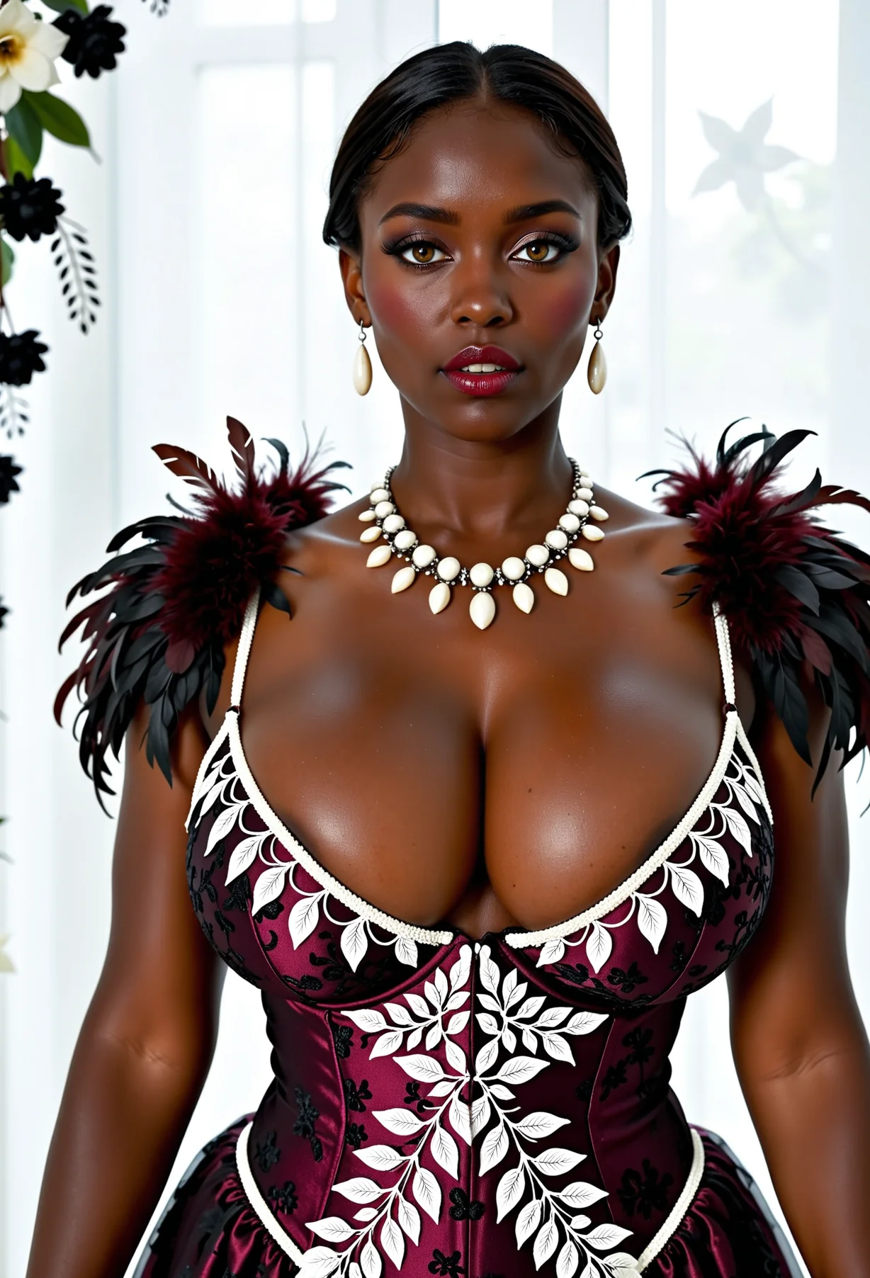 The image is a portrait of a young African-American woman. She is wearing a maroon dress with white floral patterns and a pearl necklace. Her hair is styled in a high bun with red feathers on top. She has dark makeup on and is looking directly at the camera with a serious expression. The background is a dark blue wall with a potted plant on the left side. The overall mood of the image is dramatic and glamorous.The image is a portrait of a young African-American woman posing in a garden. She is wearing a maroon dress with white floral patterns and a pearl necklace. Her hair is styled in a high bun with a red feather in her hair. She has a serious expression on her face and is looking directly at the camera. The background is blurred, but it appears to be a garden with plants and flowers. The lighting is soft and natural, highlighting the woman's features.The image is a portrait of a young woman posing in a tropical setting. She is wearing a maroon corset with white feathers on it and a statement necklace. Her hair is styled in a high ponytail with orange and yellow feathers on top. She has dark makeup on and is looking directly at the camera with a serious expression. The background is blurred, but it appears to be a wall with a clock and plants. The overall mood of the image is glamorous and exotic.The image is a portrait of a young African-American woman posing in a tropical setting. She is wearing a black and white corset with a floral pattern and red feathers on the shoulders and arms. The corset is strapless and has a deep V-neckline. The woman is also wearing a statement necklace and large hoop earrings. Her hair is styled in a high bun with black feathers cascading down her back. She has a serious expression on her face and is looking directly at the camera. The background is blurred, but it appears to be a tropical garden with green plants and foliage.The image is a portrait of a young African-American woman posing in a seductive manner. She is wearing a maroon and white corset with a floral pattern and a pearl necklace. Her hair is styled in loose curls and she is wearing red lipstick. The background is dark and there are plants and flowers surrounding her. The woman is looking directly at the camera with a sultry expression on her face. The lighting is dramatic and the overall mood of the image is sensual.The image is a portrait of a young woman with blonde hair styled in a high ponytail with a black flower in her hair. She is wearing a maroon dress with white floral embroidery on the bodice and sleeves. The dress has a deep V-neckline and is cinched at the waist with a lace-up detail. The woman is also wearing a statement necklace with a large pendant. She has a serious expression on her face and is looking directly at the camera. The background is blurred, but it appears to be a garden or outdoor setting with plants and a black wall.The image is a portrait of a young woman with shoulder-length brunette hair styled in a high ponytail with a red feather in her hair. She is wearing a maroon corset with white floral embroidery on the bodice and sleeves. The corset has a deep V-neckline and is cinched at the waist with a thin strap. The woman is also wearing a statement necklace with a large pendant. She has a serious expression on her face and is looking directly at the camera. The background is a dark blue wall with white flowers and a potted plant. The overall mood of the image is dark and mysterious.The image is a portrait of a young woman with shoulder-length brunette hair styled in a high bun with a red feather headpiece on top. She is wearing a maroon dress with white floral embroidery and a pearl necklace. The dress has a deep V-neckline and is cinched at the waist with thin straps. The woman is looking directly at the camera with a serious expression on her face. The background is blurred, but it appears to be an old, dilapidated room with peeling paint and a plant in the corner. The overall mood of the image is dark and mysterious.The image is a portrait of a young woman with blonde hair styled in an elegant updo. She is wearing a maroon dress with white floral embroidery on the bodice and sleeves. The dress has a deep V-neckline and thin straps that cross over her chest. The woman is also wearing a pearl necklace and earrings. She has a black feather headpiece on her head and is looking directly at the camera with a serious expression. The background is dark and there are plants and flowers in the background. The overall mood of the image is sophisticated and elegant.The image is a portrait of a young woman with blonde hair and blue eyes. She is wearing a maroon dress with white floral embroidery on the bodice and sleeves. The dress has a deep V-neckline and is cinched at the waist with a pearl necklace. The woman is also wearing a black flower in her hair, which is styled in loose waves. She has a serious expression on her face and is looking off to the side. The background is a dark blue with a floral pattern. The overall mood of the image is elegant and sophisticated.The image is a portrait of a young woman with blonde hair styled in a high ponytail with a black feather headpiece. She is wearing a red corset with white flowers on it and a black necklace. The corset is strapless and has a deep V-neckline. The woman is posing with one hand on her hip and the other resting on her thigh. She has a serious expression on her face and is looking directly at the camera. The background is blurred, but it appears to be a room with plants and flowers. The overall mood of the image is dark and mysterious.The image is a portrait of a young woman with blonde hair styled in a high ponytail with a black flower in her hair. She is wearing a maroon corset with white flowers on it and a black necklace. The corset has a ruffled hemline and is cinched at the waist with a thin strap. The woman is standing in front of a black background with plants and flowers in the background. She has a s