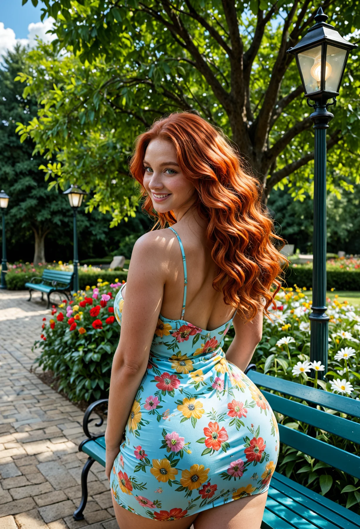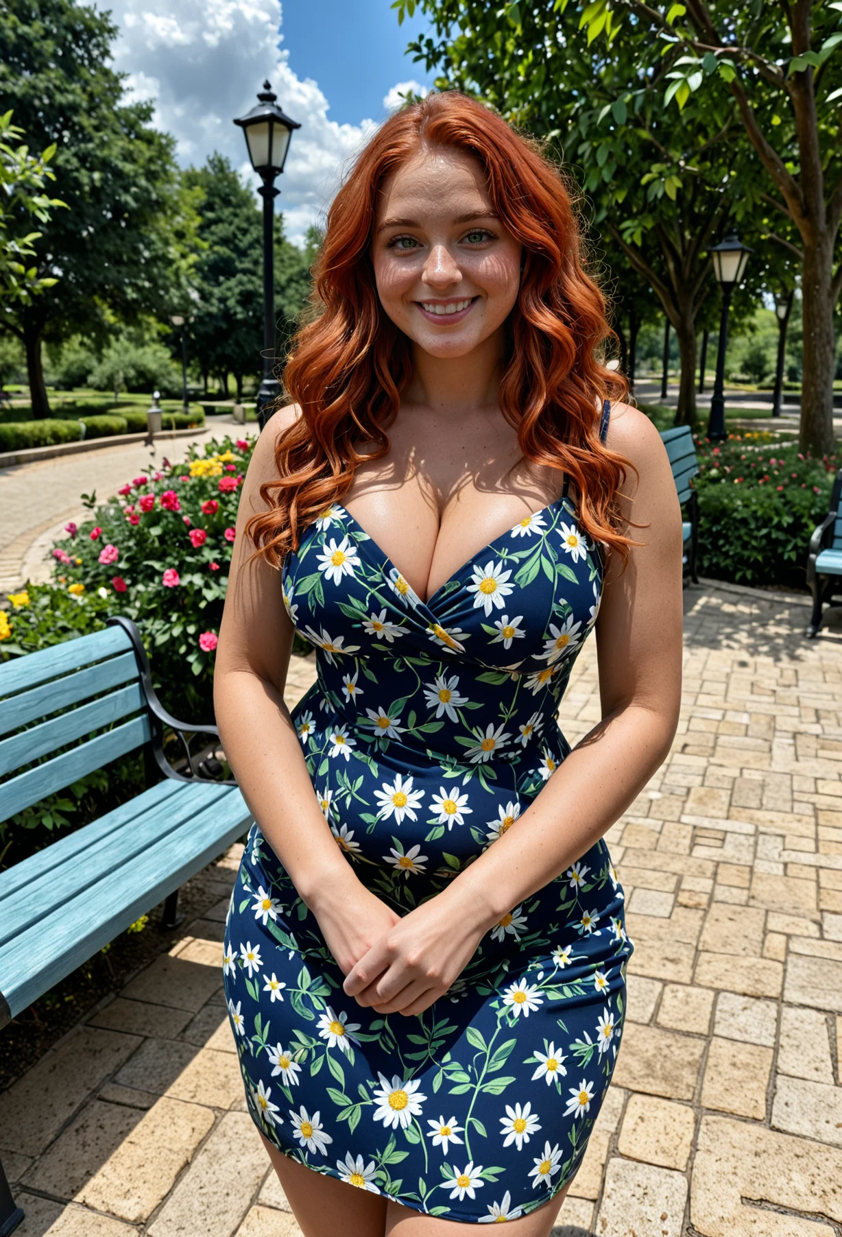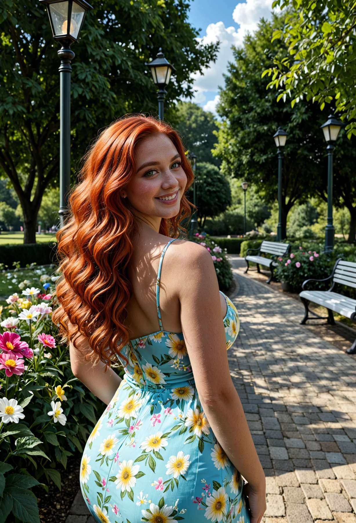 The image shows a young woman with long red hair standing in a park. She is wearing a white dress with a floral pattern and is posing with one hand on her hip and the other resting on her thigh. She has a big smile on her face and is looking directly at the camera. The park is filled with colorful flowers and trees, and there are benches and lampposts in the background. The sky is blue and the overall mood of the image is happy and relaxed.The image shows a young woman with long red hair standing in a park. She is wearing a white dress with blue and red flowers on it. The dress is strapless and has a sweetheart neckline. The woman is standing with her back to the camera, facing the camera and smiling at the camera. She has long, wavy red hair that is styled in loose waves and falls over her shoulders. The park is filled with colorful flowers and trees, and there are benches and lampposts in the background. The sky is blue and the weather appears to be sunny and pleasant.The image shows a young woman with long red hair standing in a park. She is wearing a light blue dress with white daisies on it. The dress has thin straps and a low neckline. The woman is standing with her back to the camera, facing the camera and smiling at the camera. She has her hands on her hips and is standing in front of a blue bench. The park is filled with colorful flowers and trees, and there are lampposts in the background. The sky is blue and the weather appears to be sunny and pleasant.The image shows a young woman standing in a park. She is wearing a blue dress with white daisies on it and a wide-brimmed straw hat with a white flower on top. She has long red hair and is smiling at the camera. The woman is standing next to a wooden bench and there are trees and flowers in the background. The sky is blue and the weather appears to be sunny and pleasant.The image is a portrait of a young woman with long red hair. She is standing in a park with a blue bench and a lamp post in the background. The woman is wearing a light blue dress with white and yellow flowers on it. She has a big smile on her face and is looking directly at the camera. The sky is blue and there are trees and flowers in the park.The image shows a young woman with long red hair standing in a park. She is wearing a light blue dress with white daisies on it. The dress has thin straps and a flowy skirt that falls below her knees. She has a smile on her face and is looking directly at the camera. In the background, there are trees, flowers, and a bench. The sky is blue and the weather appears to be sunny.The image shows a young woman with long red hair standing in a park. She is wearing a purple dress with white daisies on it. The dress has a sweetheart neckline and is cinched at the waist with a thin strap. The woman is posing with one hand on her hip and the other resting on a wooden bench. She has a big smile on her face and is looking directly at the camera. In the background, there are trees and flowers, and a lamppost can be seen on the right side of the image.The image shows a young woman with long red hair standing in a park. She is wearing a red dress with white daisies on it. The dress has thin straps and a low neckline. The woman is standing with her back to the camera, facing the camera and smiling at the camera. In the background, there are trees, flowers, and a bench. The sky is blue and the weather appears to be sunny.The image shows a young woman standing in a park. She is wearing a yellow dress with a floral pattern and a wide-brimmed straw hat. She has long red hair and is smiling at the camera. The park is filled with colorful flowers and there is a wooden bench on the left side of the image. The sky is blue and there are trees and lampposts in the background.The image shows a young woman with long red hair standing in a park. She is wearing a pink floral dress with a halter neckline and thin straps. The dress is knee-length and falls above her knees. She has her hands on her hips and is smiling at the camera. In the background, there is a park bench and a lamppost with a lamp post. The park is filled with colorful flowers and trees. The sky is blue and the overall mood of the image is happy and relaxed.The image shows a young woman with long red hair standing in a park. She is wearing a yellow dress with white daisies on it. The dress has thin straps and a low neckline. The woman is standing in front of a green bench and there are trees and flowers in the background. She has a big smile on her face and is looking directly at the camera.The image shows a young woman with long red hair standing in a park. She is wearing a green dress with white daisies on it. The dress has a deep V-neckline and thin straps. The woman is standing with her back to the camera, facing away from the camera. She has a smile on her face and is looking off to the side. In the background, there is a park bench and a variety of colorful flowers and trees. The sky is blue and the weather appears to be sunny.The image shows a young woman with long red hair standing in a park. She is wearing a strapless orange dress with white daisies printed all over it. The dress has a sweetheart neckline and is cinched at the waist with a thin strap. The woman is standing with one hand on her hip and the other resting on a wooden bench. She has a smile on her face and is looking off to the side. The park is filled with colorful flowers and trees, and there are lampposts in the background. The sky is blue and the overall mood of the image is happy and relaxed.The image shows a young woman with long red hair standing in a garden. She is wearing a yellow dress with white daisies on it. The dress has thin straps and a low neckline. The woman is smiling and looking at the camera. Behind her, there is a wooden bench and a lamppost. The garden is filled with colorful flowers and trees. The sky is blue and the weather appears to be sunny.The image shows a young woman with long red hai