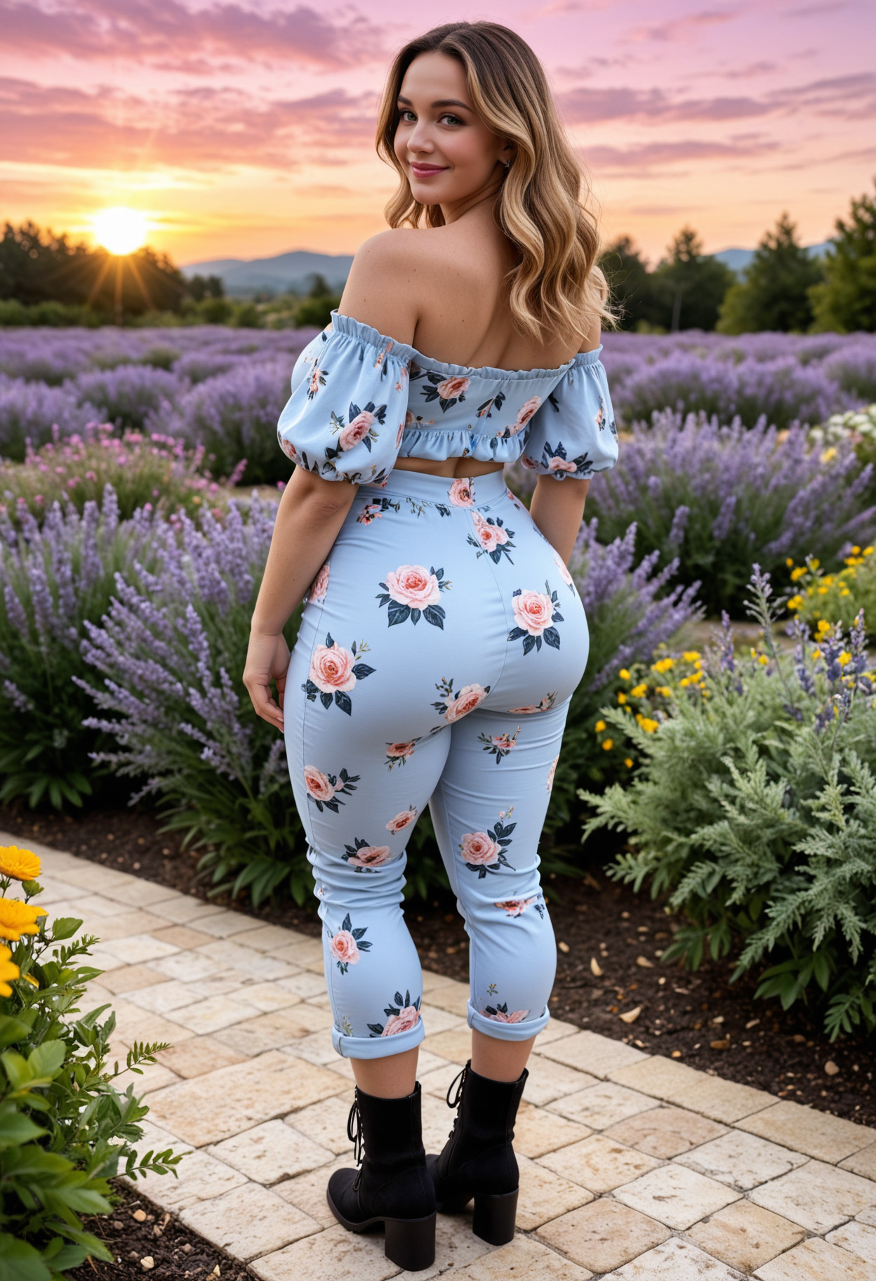 - ass, bare shoulders, black footwear, blonde hair, blue eyes, blue pants, blue shirt, boots, brown hair, floral print, flower, from behind, full body, lips, long hair, looking at viewer, looking back, multicolored hair, off shoulder, off-shoulder shirt, outdoors, pants, sky, smile, solo, standing, sunset, tree