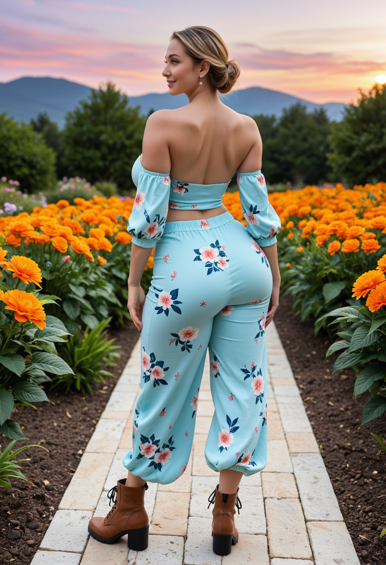 - arms at sides, black footwear, blonde hair, blue eyes, blue pants, blue shirt, boots, breasts, brown hair, bush, cleavage, clothing cutout, collarbone, earrings, floral print, flower, full body, garden, jewelry, large breasts, lips, long sleeves, looking at viewer, orange flower, outdoors, pants, path, pink flower, plant, shadow, shoulder cutout, smile, solo, standing, sunset, tree, yellow flower
