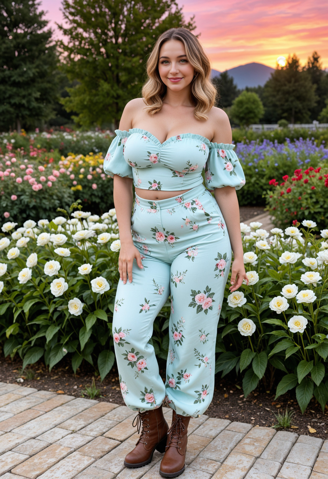 - ass, bare shoulders, black footwear, blonde hair, blue eyes, blue pants, blue shirt, boots, breasts, brown hair, floral print, flower, from behind, full body, hand on hip, large breasts, lips, long hair, looking at viewer, looking back, off shoulder, outdoors, pants, short sleeves, sky, smile, solo, standing, sunset, white flower