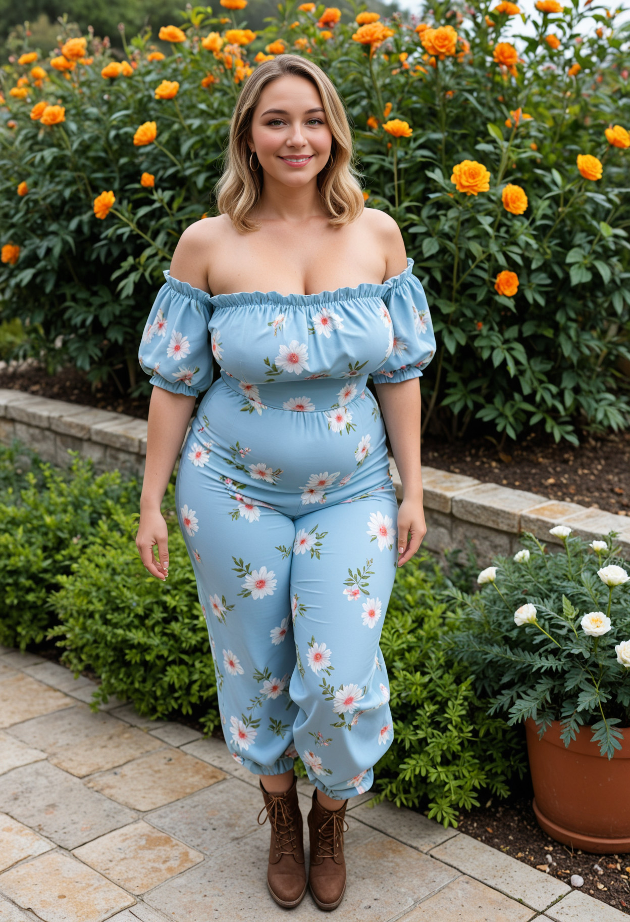 - arms at sides, bare shoulders, blonde hair, blue shirt, boots, breasts, brown footwear, brown hair, cleavage, collarbone, curvy, floral print, flower, full body, garden, large breasts, lips, long hair, looking at viewer, medium hair, off shoulder, off-shoulder shirt, outdoors, pajamas, plant, plump, shadow, short sleeves, smile, solo, standing