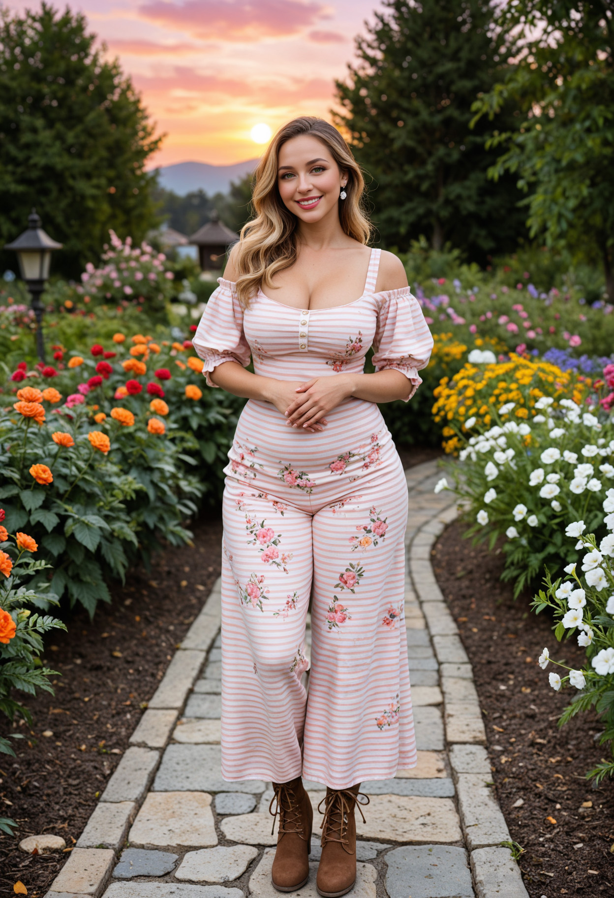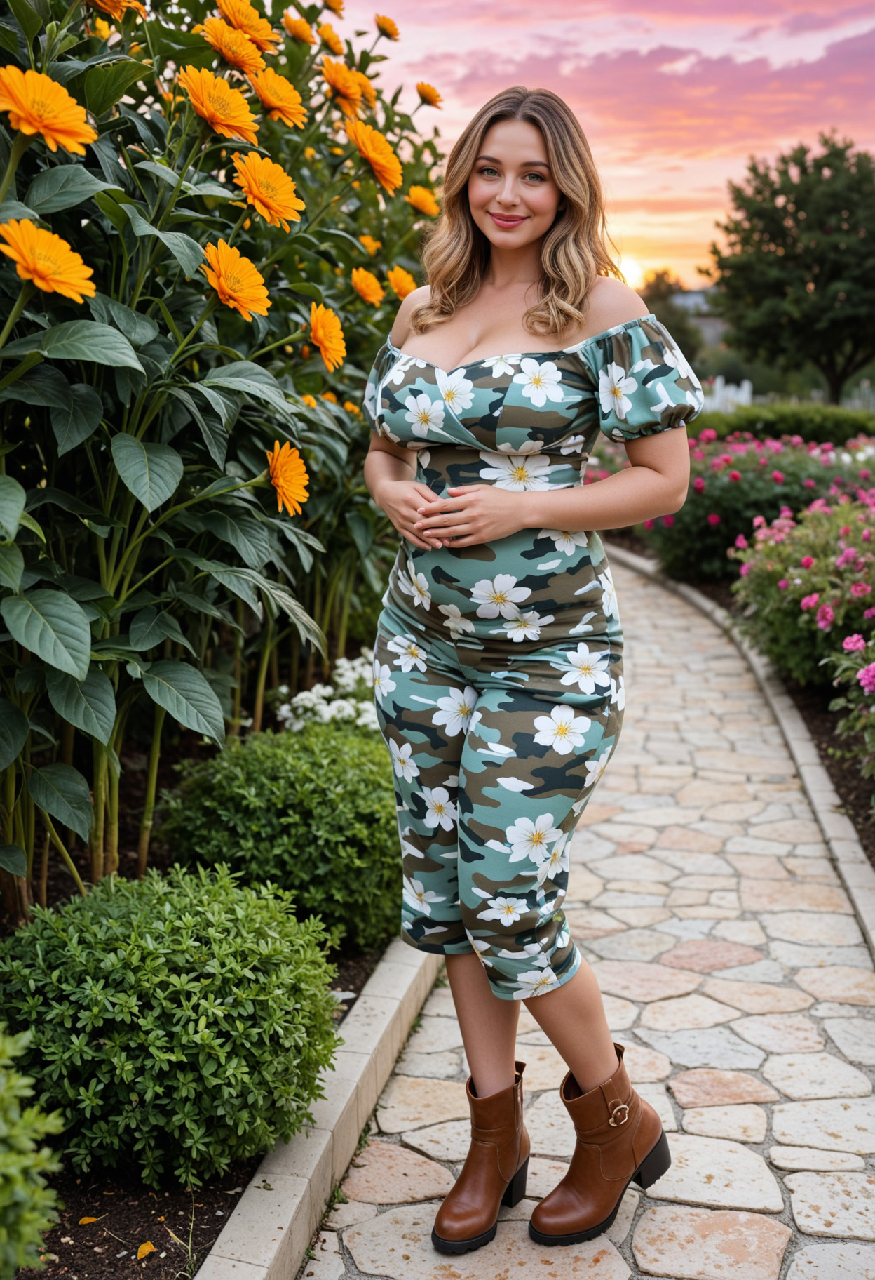 - bare shoulders, blonde hair, blue dress, blue eyes, blurry, boots, breasts, brown footwear, brown hair, cloud, dress, floral print, flower, full body, hand on own stomach, large breasts, lips, long hair, long sleeves, looking at viewer, medium hair, off shoulder, outdoors, plump, realistic, shadow, sky, smile, solo, standing, sunset, white flower