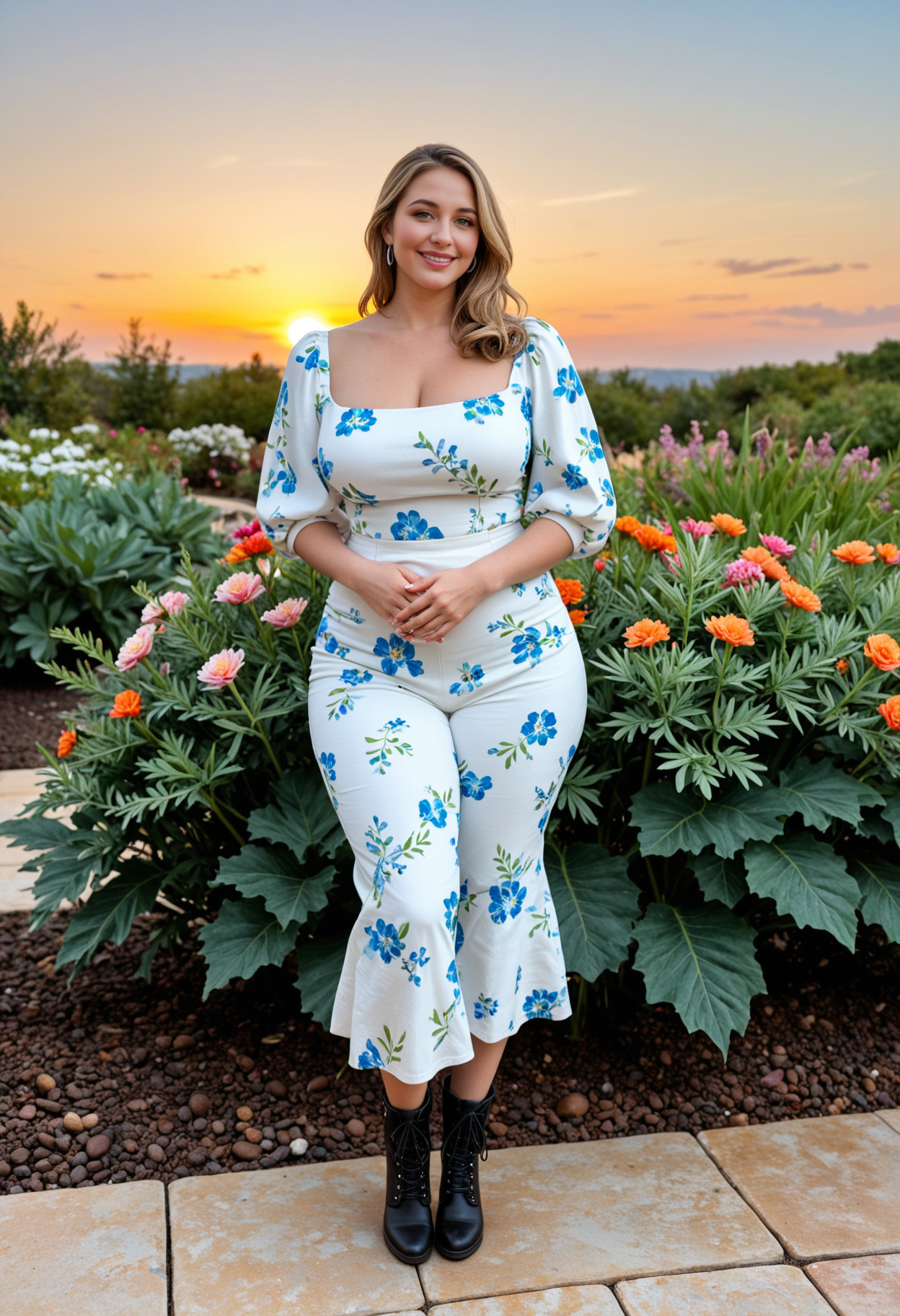 - black footwear, boots, breasts, brown hair, cleavage, curvy, dress, field, floral print, flower, flower field, full body, large breasts, lips, looking at viewer, outdoors, realistic, sky, smile, solo, standing, sunset