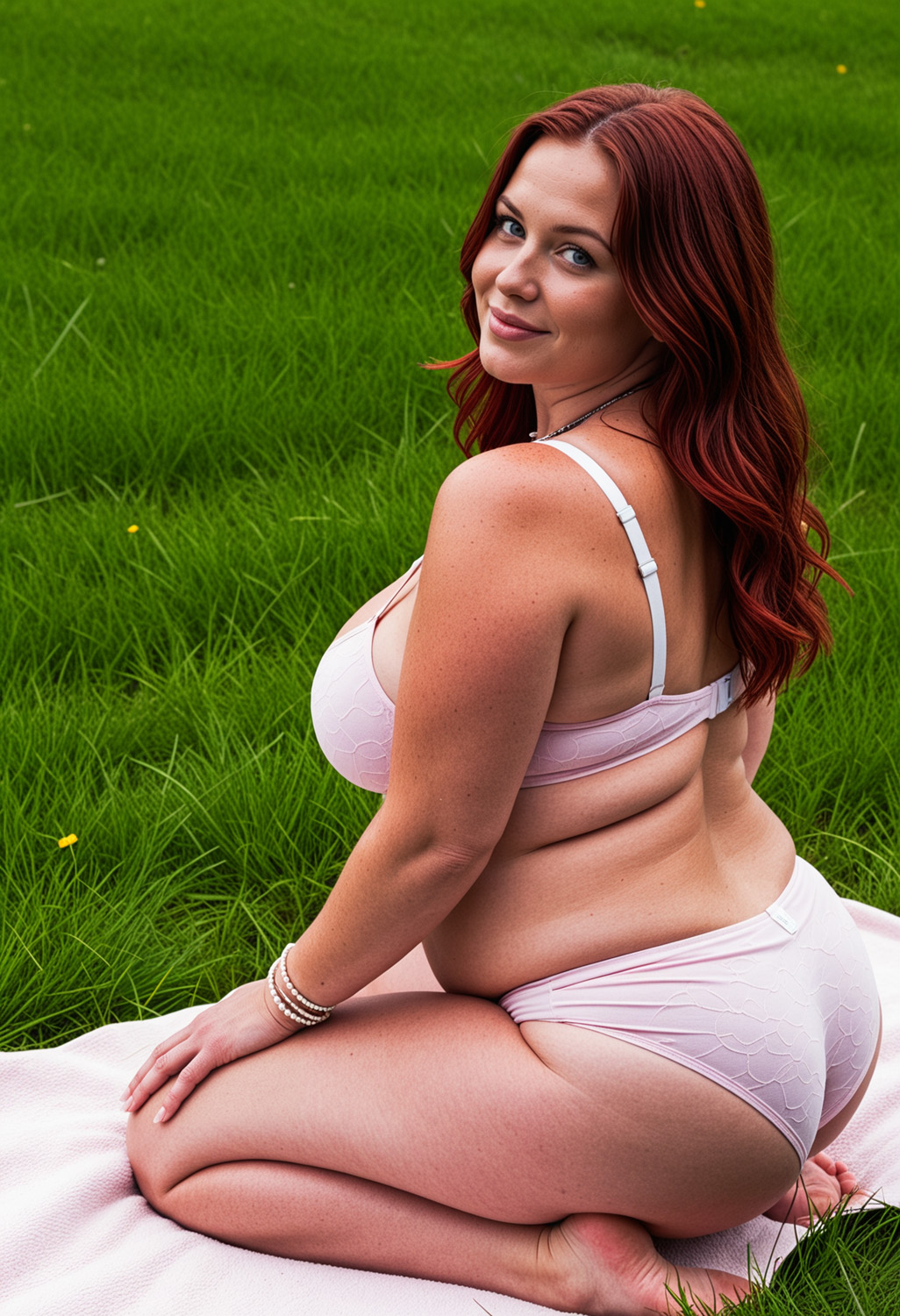 - ass, barefoot, bra, bracelet, breasts, brown eyes, brown hair, feet, freckles, grass, jewelry, large breasts, lingerie, long hair, looking at viewer, necklace, panties, realistic, red hair, seiza, sitting, smile, solo, thighs, underwear, underwear only