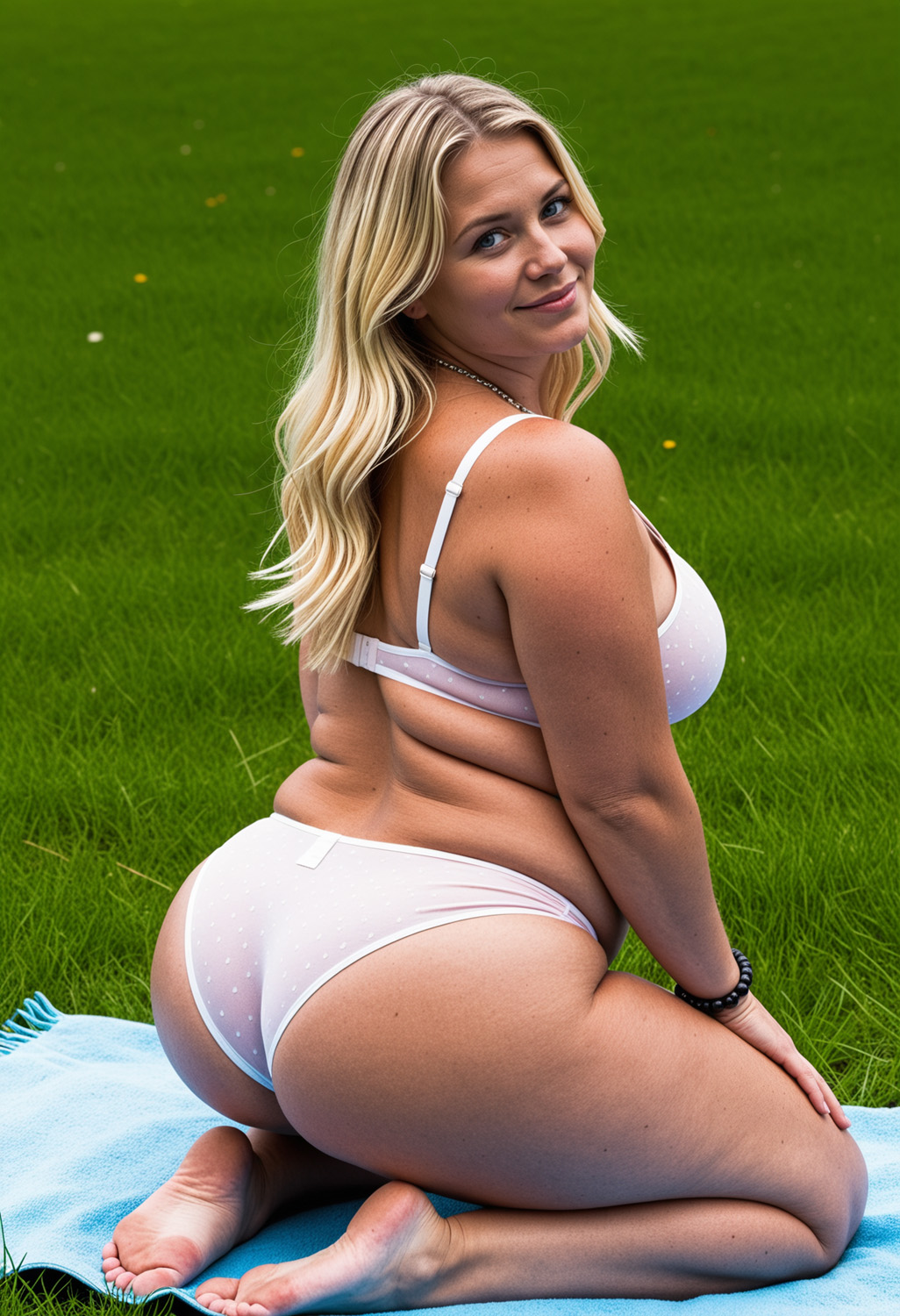 - ass, barefoot, beads, blonde hair, blue eyes, bra, bracelet, breasts, feet, freckles, from behind, full body, grass, jewelry, kneeling, large breasts, lips, long hair, looking at viewer, looking back, necklace, panties, realistic, smile, soles, solo, thighs, toes, underwear, underwear only, white bra, white panties