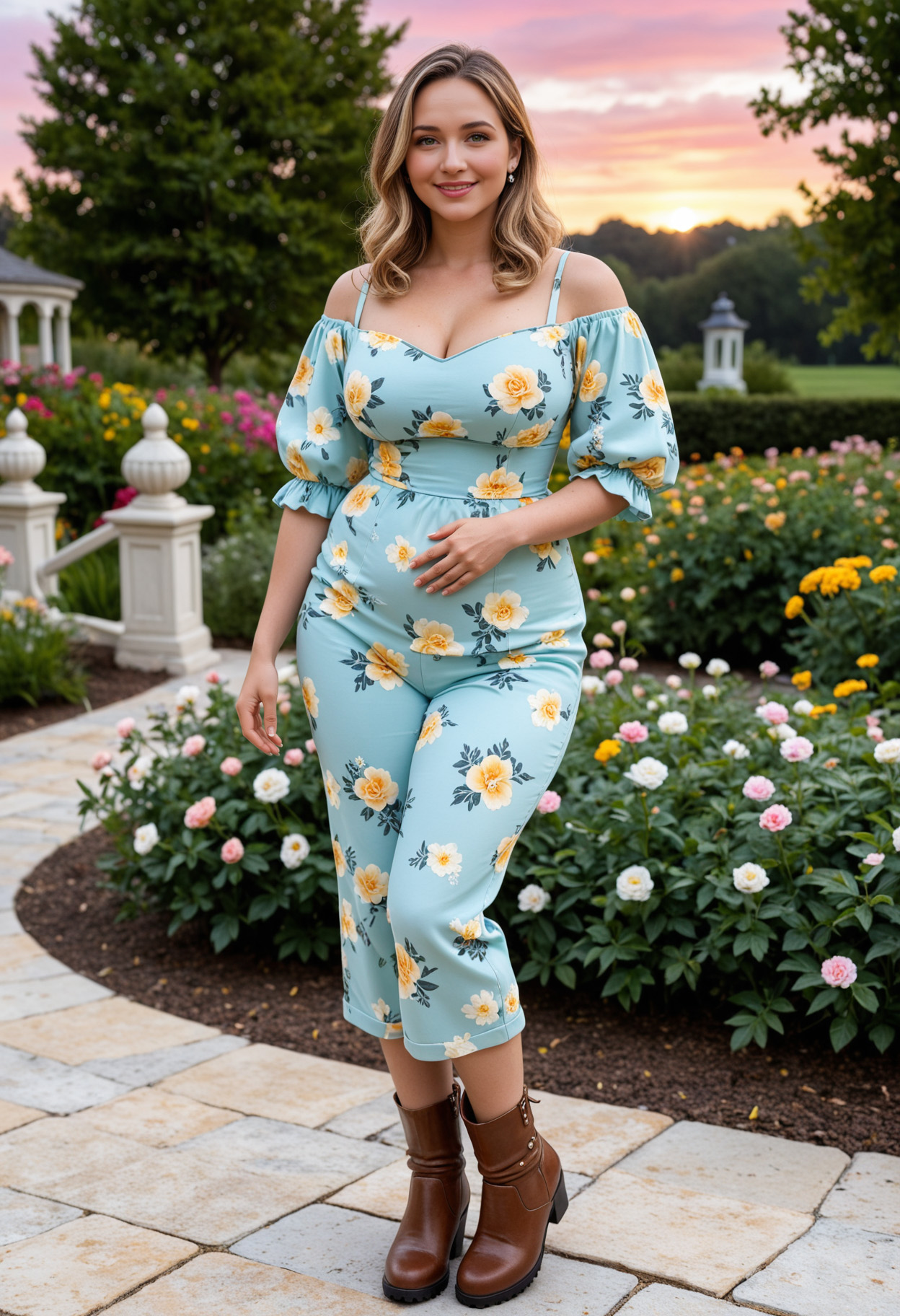 - blonde hair, blue eyes, boots, breasts, brown footwear, collarbone, cross-laced footwear, curvy, dress, floral print, flower, full body, garden, large breasts, lips, long hair, looking at viewer, medium hair, outdoors, plump, shadow, smile, solo, standing, sunset, tree