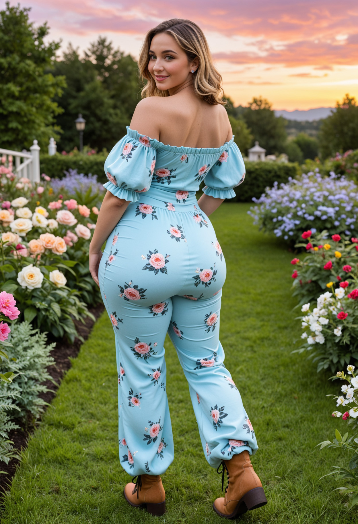 - ass, bare shoulders, blonde hair, blue pants, blue shirt, boots, breasts, brown footwear, dark skin, earrings, floral print, flower, from behind, full body, garden, grass, high heel boots, high heels, jewelry, lips, long hair, looking at viewer, looking back, multicolored hair, off shoulder, off-shoulder shirt, outdoors, pants, smile, solo, standing, sunset, tree