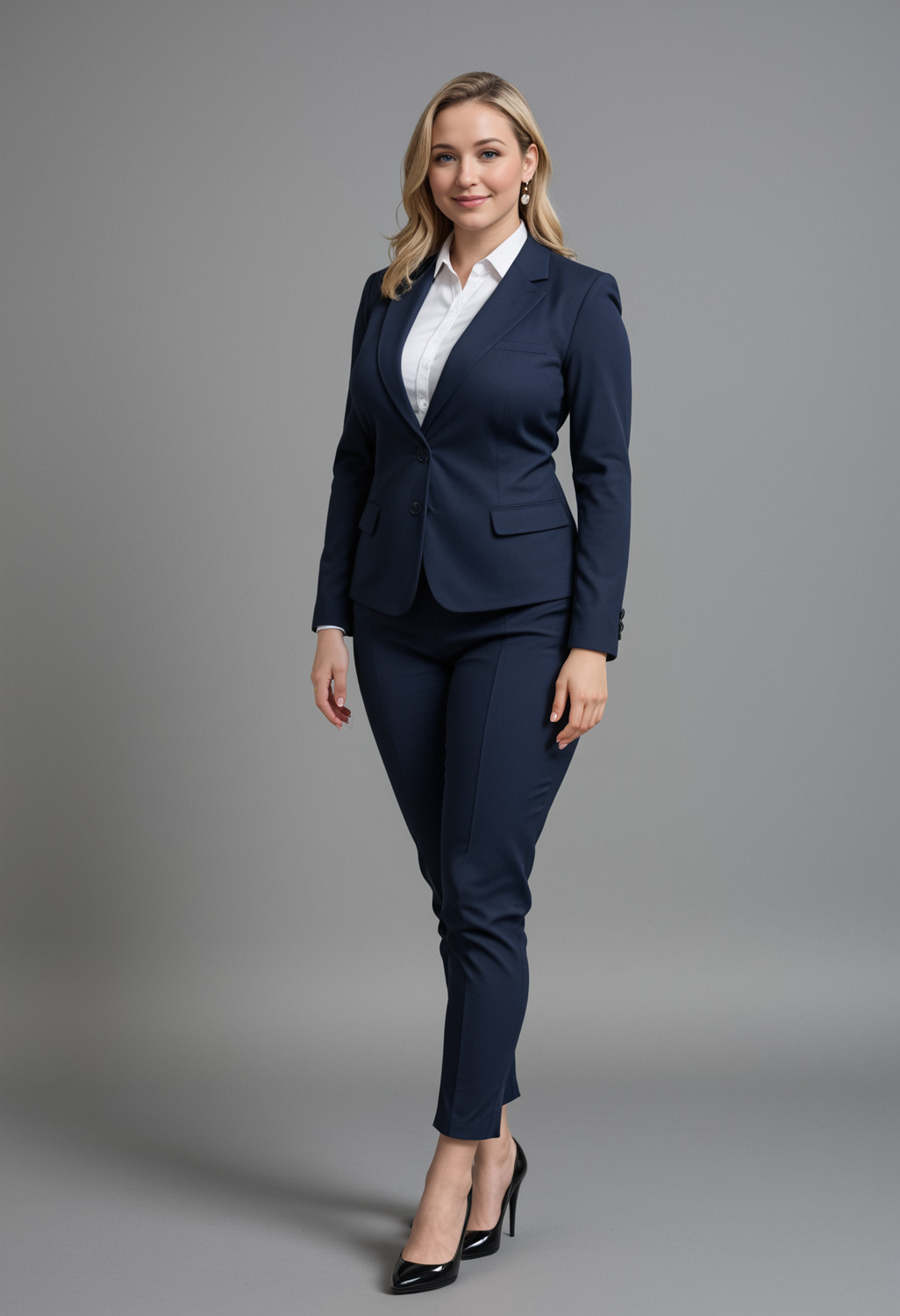 - arms at sides, black footwear, black jacket, black pants, blonde hair, blue eyes, blue jacket, blue pants, breasts, buttons, closed mouth, collared shirt, earrings, formal, full body, grey background, high heels, jacket, jewelry, lips, long hair, long sleeves, looking at viewer, nail polish, office lady, pant suit, pants, realistic, red nails, shadow, simple background, smile, solo, standing, suit, white shirt