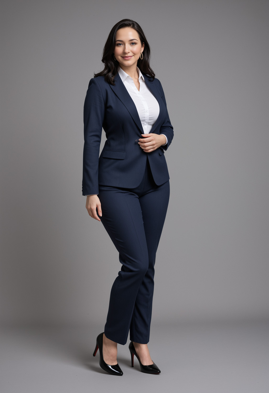 - arms at sides, black footwear, blue eyes, blue jacket, blue pants, breasts, brown hair, cleavage, collarbone, formal, full body, grey background, high heels, jacket, jewelry, large breasts, lips, long hair, long sleeves, looking at viewer, necklace, pants, realistic, ring, simple background, smile, solo, standing, suit