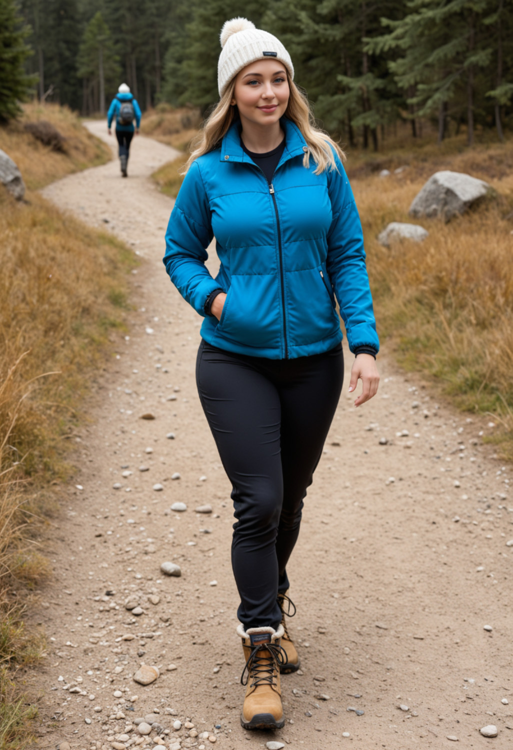 - beanie, black pants, blonde hair, blue jacket, blurry, blurry background, boots, breasts, brown footwear, day, denim, full body, grass, hand in pocket, hat, jacket, jeans, long hair, long sleeves, looking at viewer, outdoors, pants, path, photo background, photo inset, realistic, reference inset, rock, shoes, smile, solo focus, standing, tree, walking, white headwear, zipper pull tab