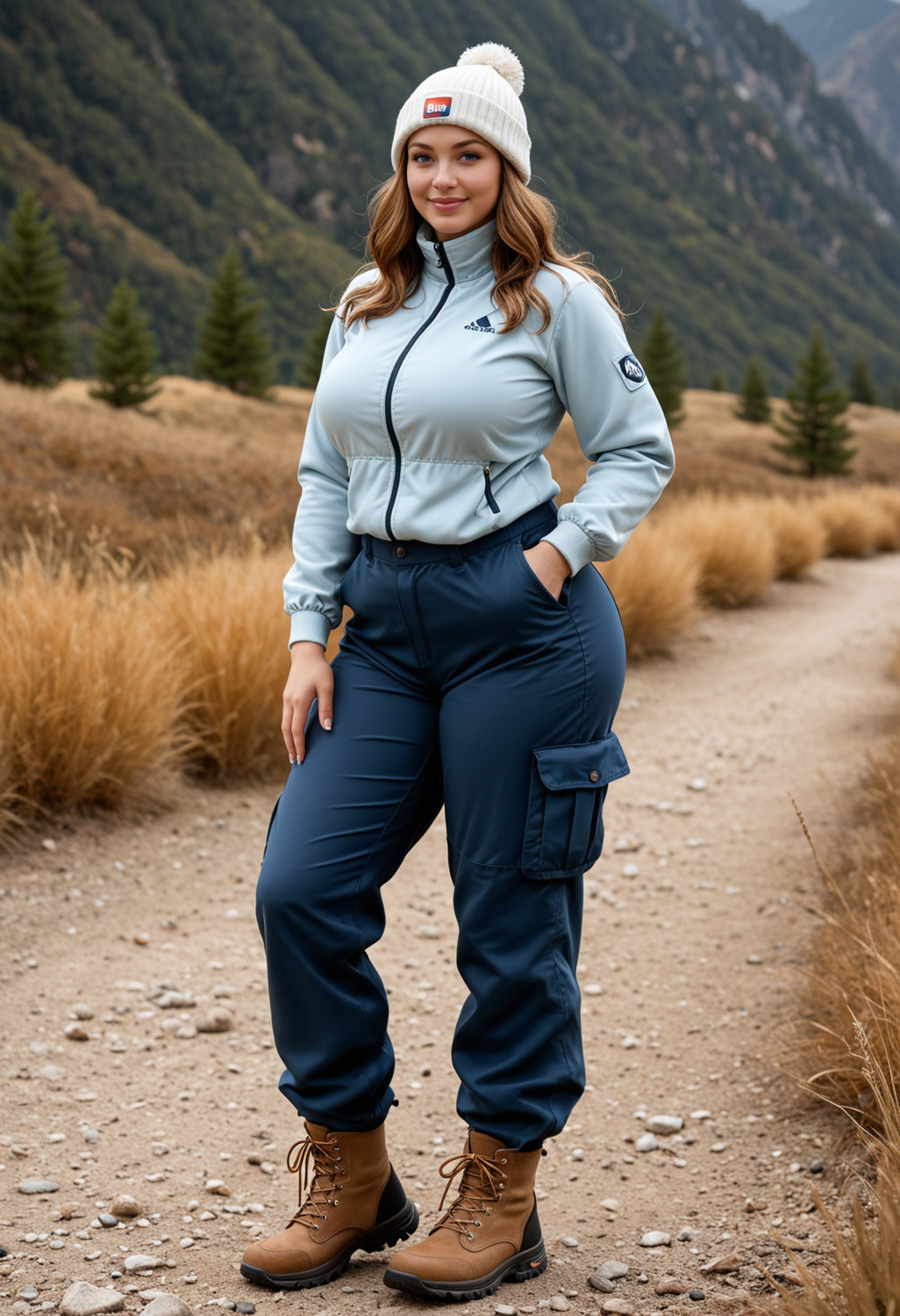 - beanie, blue eyes, blue pants, blurry, blurry background, boots, breasts, brown footwear, brown hair, denim, full body, hand in pocket, hat, jacket, jeans, large breasts, long hair, long sleeves, looking at viewer, mountain, outdoors, pants, photo background, realistic, smile, solo, standing, tree, white headwear, white jacket