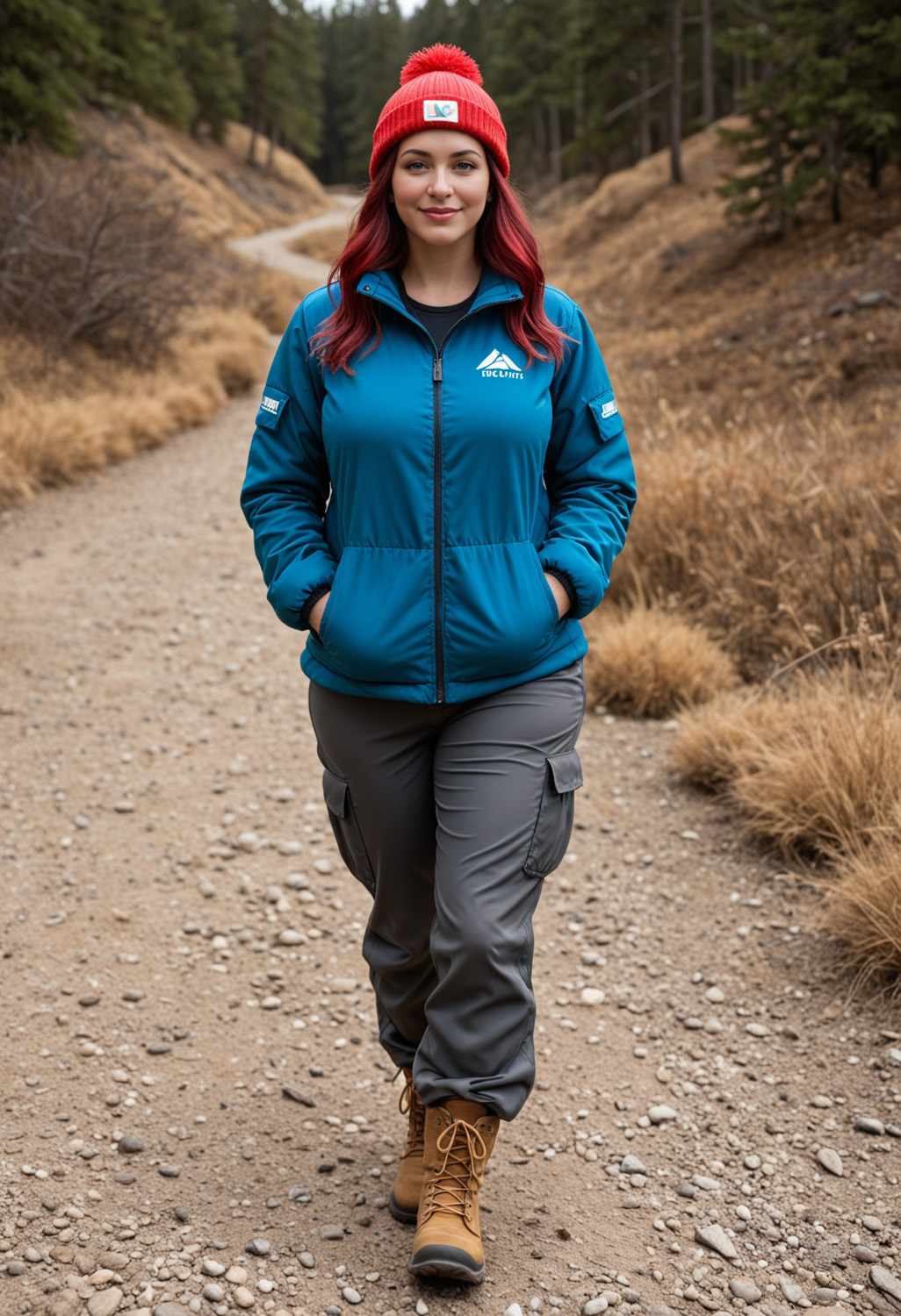 - beanie, blue eyes, blue jacket, blurry, blurry background, boots, brown footwear, day, denim, full body, grey pants, hands in pockets, hat, jacket, long hair, long sleeves, looking at viewer, outdoors, pants, photo background, realistic, red hair, red headwear, smile, solo, standing, tree, walking