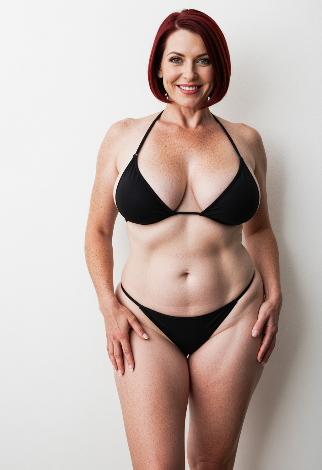 - bikini, black bikini, breasts, cleavage, earrings, freckles, grin, jewelry, large breasts, lips, looking at viewer, mature female, navel, realistic, red hair, short hair, simple background, smile, solo, swimsuit