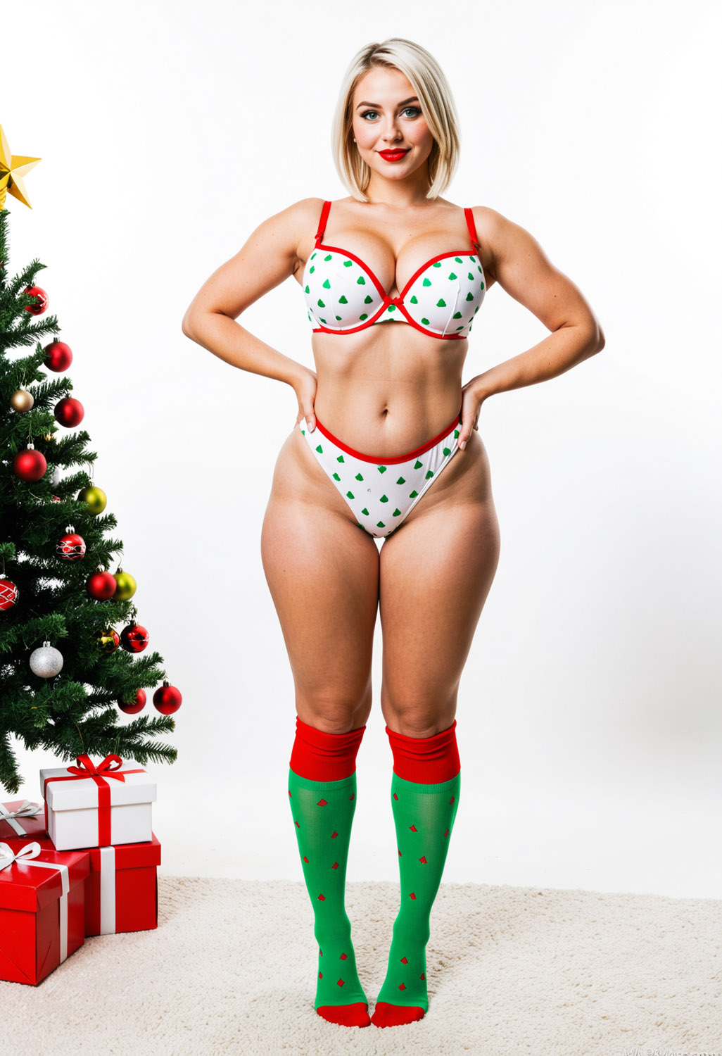 - blonde hair, blue eyes, box, bra, breasts, christmas, christmas ornaments, christmas tree, cleavage, gift, gift box, green bra, green panties, green socks, hand on hip, kneehighs, large breasts, lipstick, looking at viewer, makeup, navel, panties, short hair, socks, solo, standing, underwear, underwear only