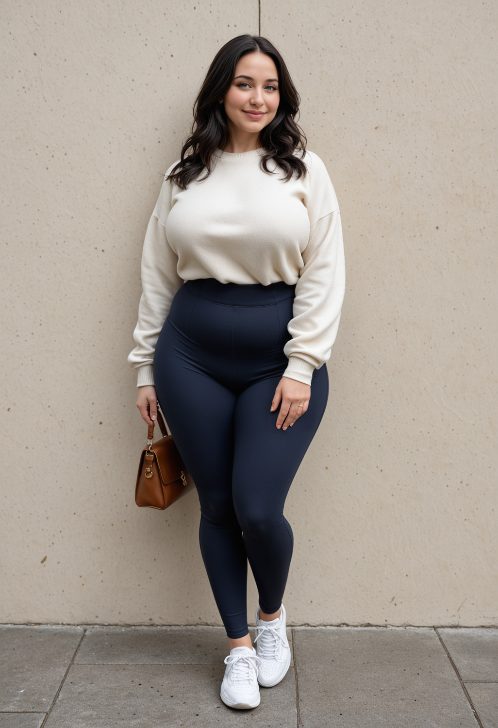- bag, black hair, breasts, curvy, denim, full body, handbag, high-waist pants, holding, holding bag, jeans, large breasts, lips, long hair, long sleeves, looking at viewer, pants, realistic, shoes, smile, sneakers, solo, standing, white footwear, white shirt