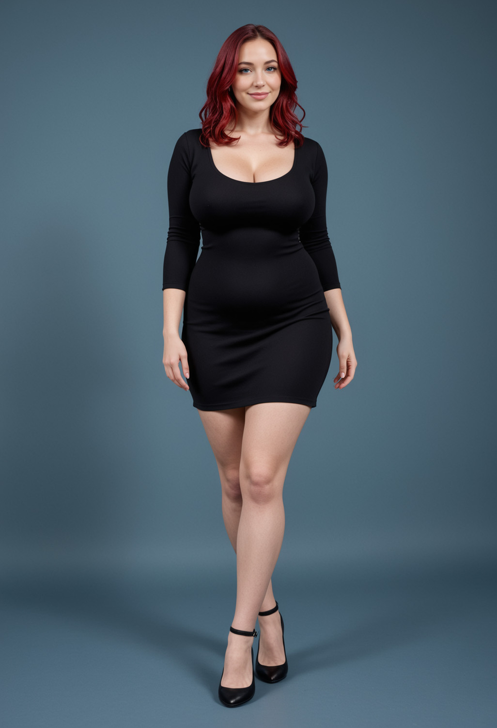 - arms at sides, black dress, black footwear, blue background, blue eyes, breasts, cleavage, curvy, dress, earrings, full body, high heels, jewelry, large breasts, lips, long hair, long sleeves, looking at viewer, realistic, red hair, red nails, smile, solo, standing, tight dress