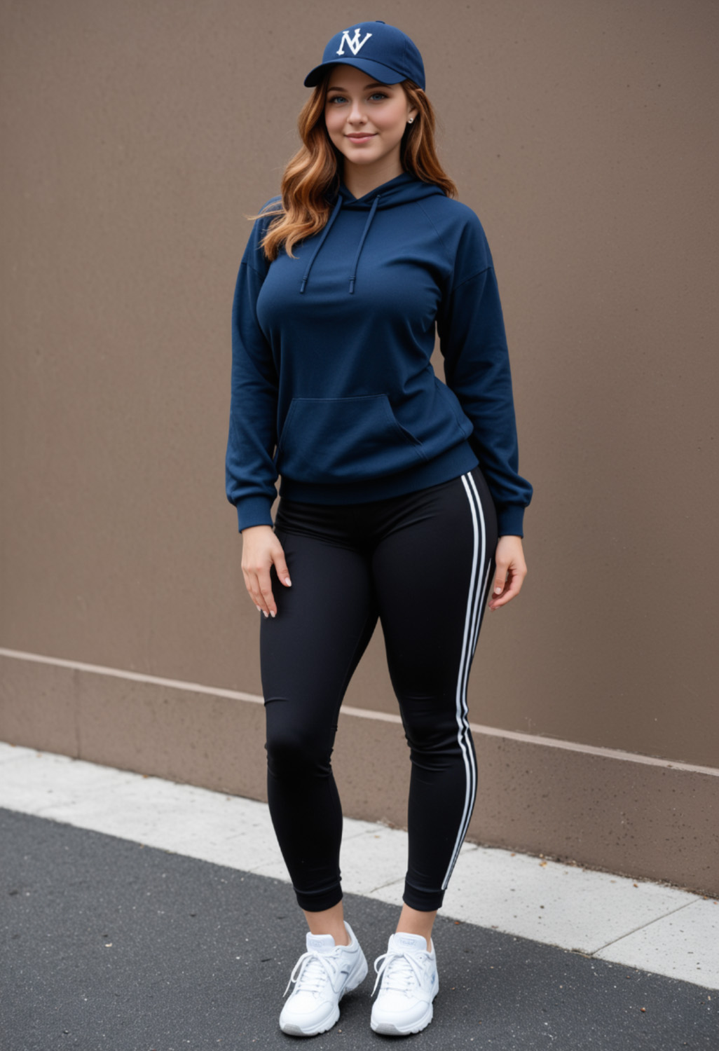 - adidas, arms at sides, baseball cap, black pants, blue eyes, blue headwear, blue hoodie, breasts, brown hair, drawstring, full body, hat, hood, hood down, hoodie, lips, long hair, long sleeves, looking at viewer, medium breasts, pants, realistic, shadow, shoes, smile, sneakers, solo, standing, track pants, white footwear