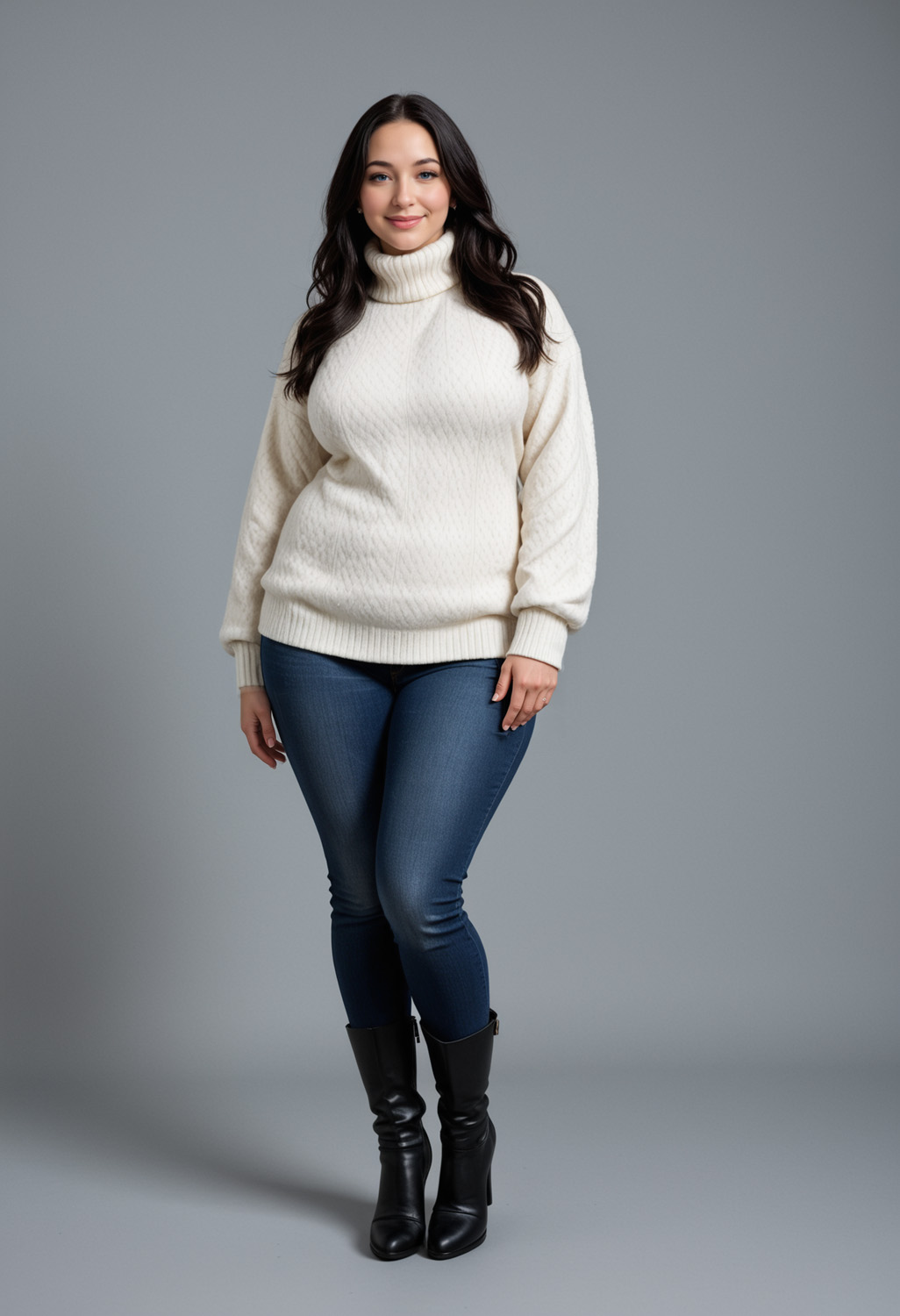 - arms at sides, black footwear, black hair, blue pants, boots, breasts, brown hair, denim, full body, grey background, jeans, lips, long hair, long sleeves, looking at viewer, pants, realistic, ribbed sweater, shadow, simple background, smile, solo, standing, sweater, turtleneck, turtleneck sweater, white sweater