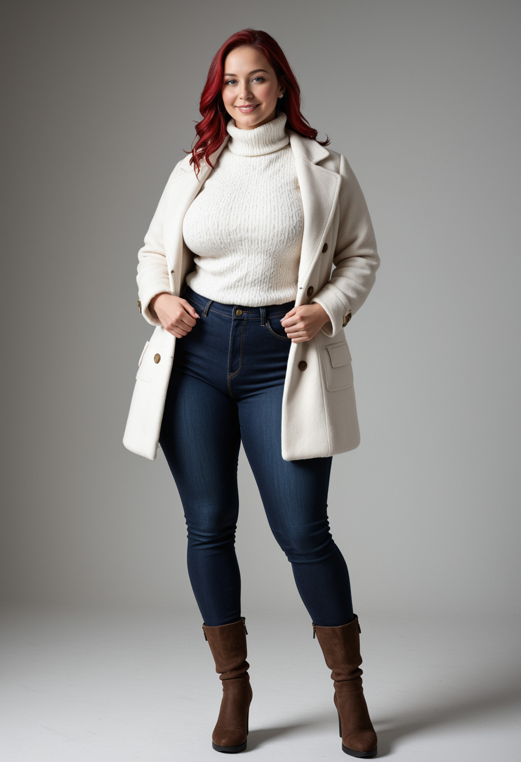 - blue pants, boots, breasts, brown footwear, coat, denim, full body, grey background, high heel boots, jeans, large breasts, leather boots, lips, long hair, long sleeves, looking at viewer, open clothes, pants, realistic, red hair, ribbed sweater, shadow, simple background, smile, solo, standing, sweater, turtleneck, turtleneck sweater, white coat, white sweater