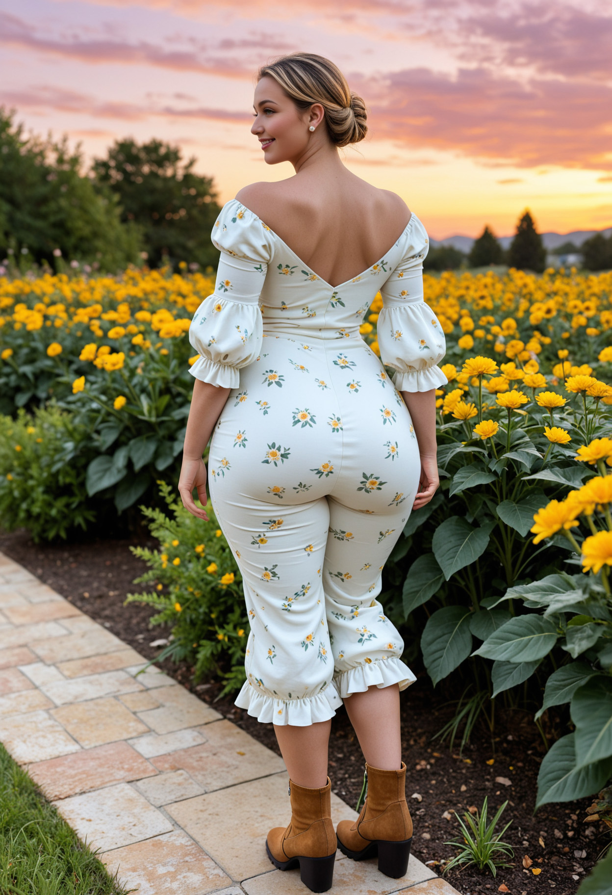 - ass, back, bare shoulders, black footwear, blonde hair, boots, brown eyes, brown hair, dress, floral print, flower, from behind, full body, garden, hair bun, lips, looking at viewer, looking back, multicolored hair, off shoulder, outdoors, single hair bun, smile, solo, standing, sunset, tree, white dress