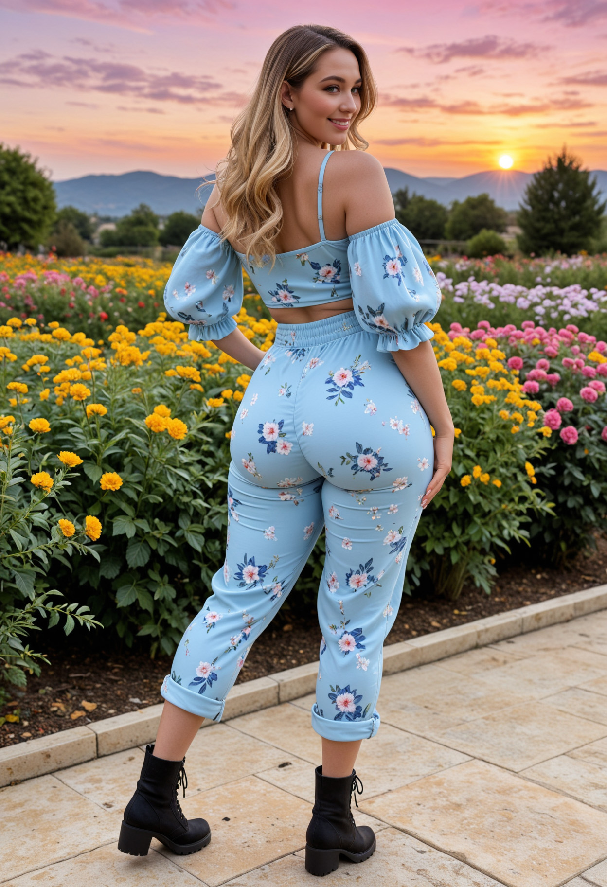 - ass, bare shoulders, black footwear, blonde hair, blue eyes, blue pants, boots, earrings, field, floral print, flower, from behind, full body, high heel boots, high heels, jewelry, lips, long hair, looking at viewer, looking back, multicolored hair, off shoulder, off-shoulder shirt, outdoors, pants, puffy sleeves, sky, smile, solo, standing, sunset, tree, yellow flower