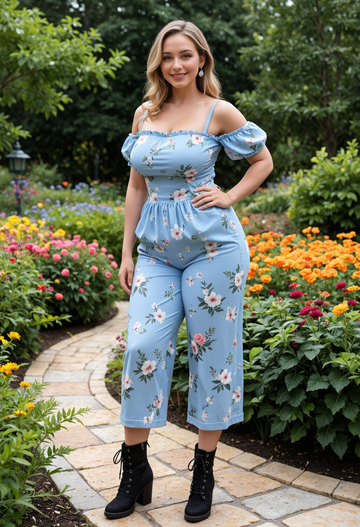 - bare shoulders, black footwear, blonde hair, blue pants, blue shirt, boots, breasts, brown eyes, cleavage, day, earrings, floral print, flower, full body, garden, hand on hip, jewelry, large breasts, long hair, looking at viewer, off shoulder, off-shoulder shirt, outdoors, pants, photo background, pink flower, short sleeves, smile, solo, standing, tree
