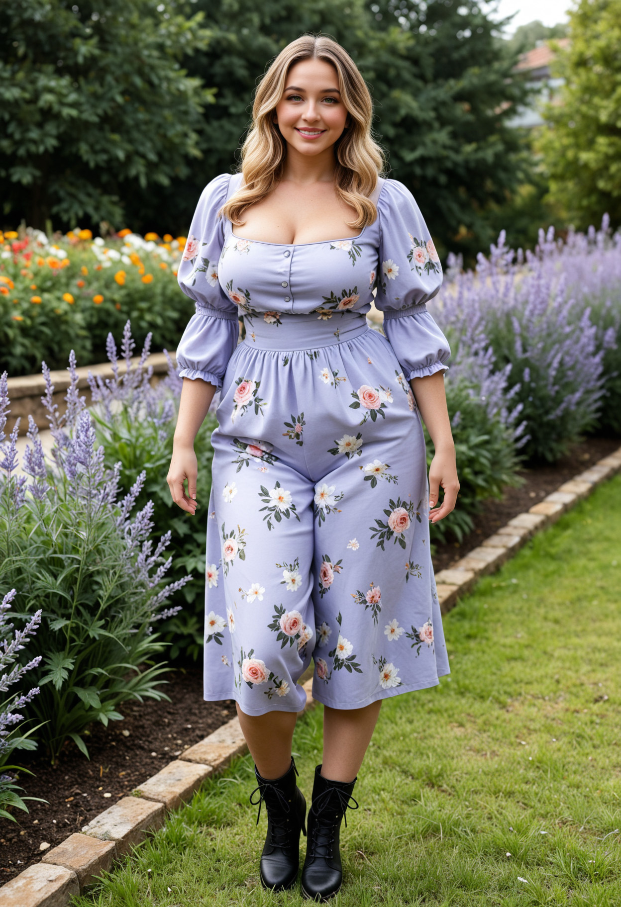- black footwear, blonde hair, blurry, boots, breasts, cleavage, day, dress, floral print, flower, full body, garden, grass, large breasts, long hair, looking at viewer, outdoors, photo background, smile, solo, standing