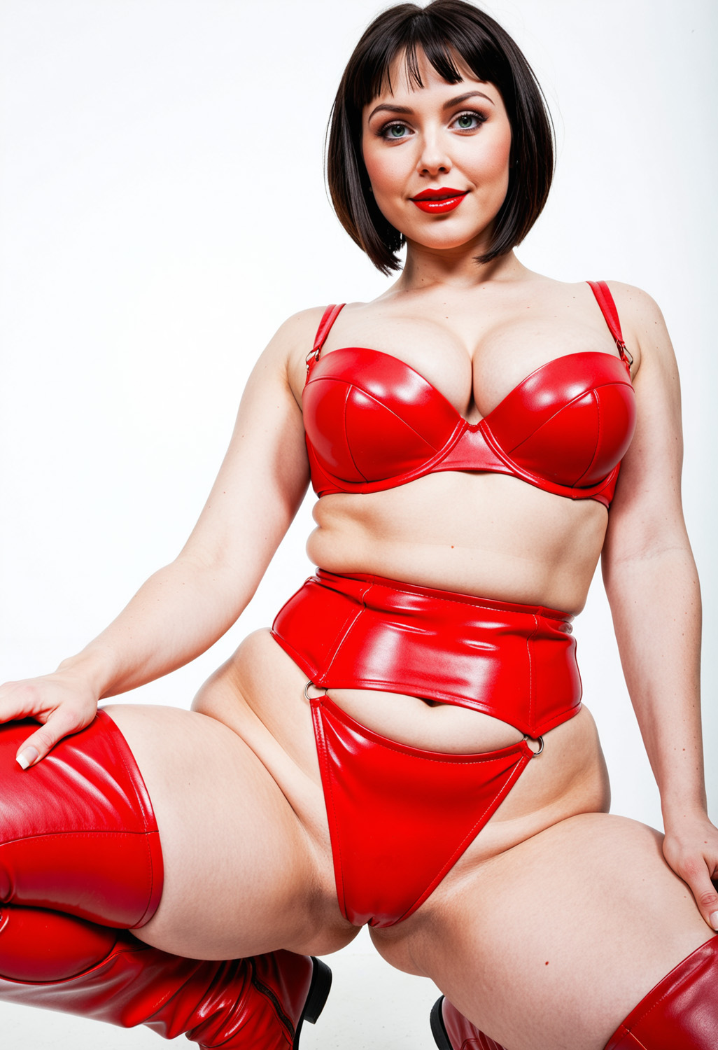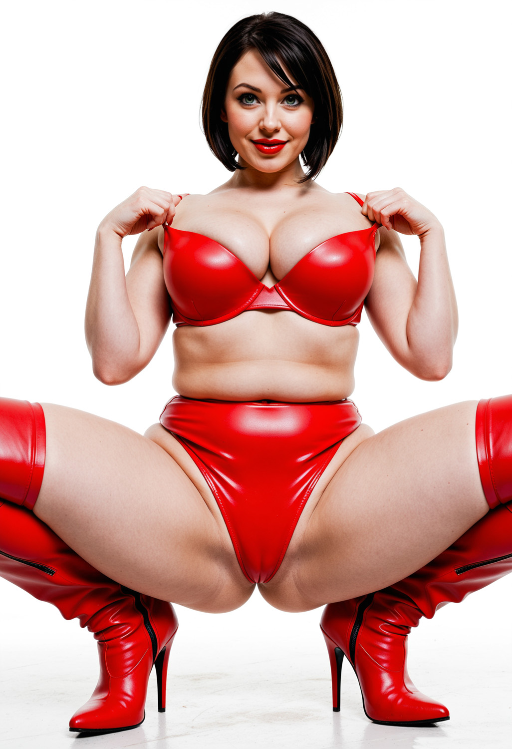 - belly, black hair, boots, bra, breasts, cleavage, large breasts, lips, lipstick, looking at viewer, makeup, navel, panties, plump, realistic, red bra, red footwear, red thighhighs, short hair, solo, spread legs, thigh boots, thighhighs, underwear