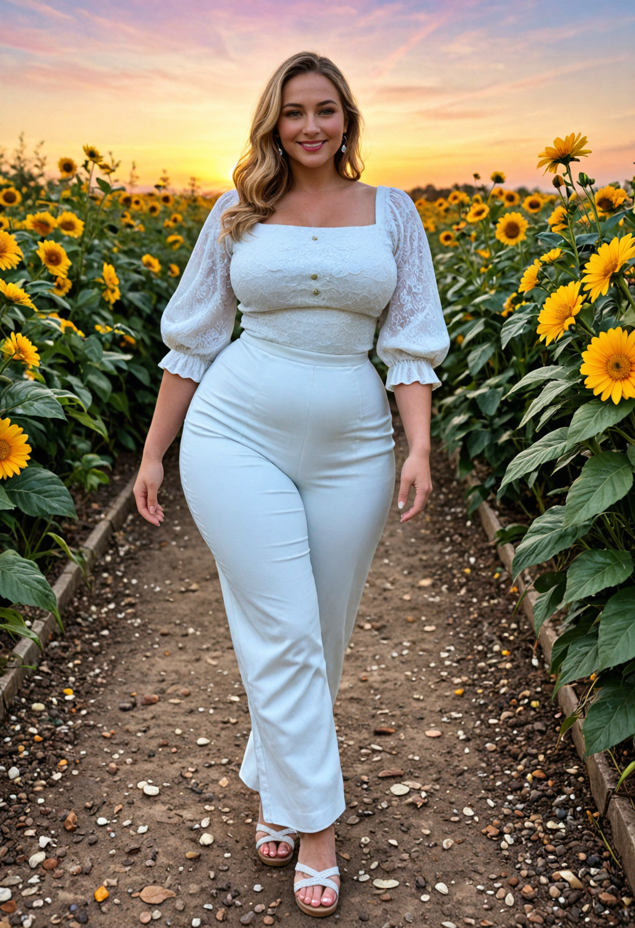 - arms at sides, blue dress, blue eyes, breasts, brown hair, cleavage, covered nipples, curvy, dress, flower, full body, hat, huge breasts, large breasts, lips, long hair, looking at viewer, mature female, outdoors, plant, plump, sandals, shadow, short sleeves, smile, solo, standing, sun hat, thick thighs