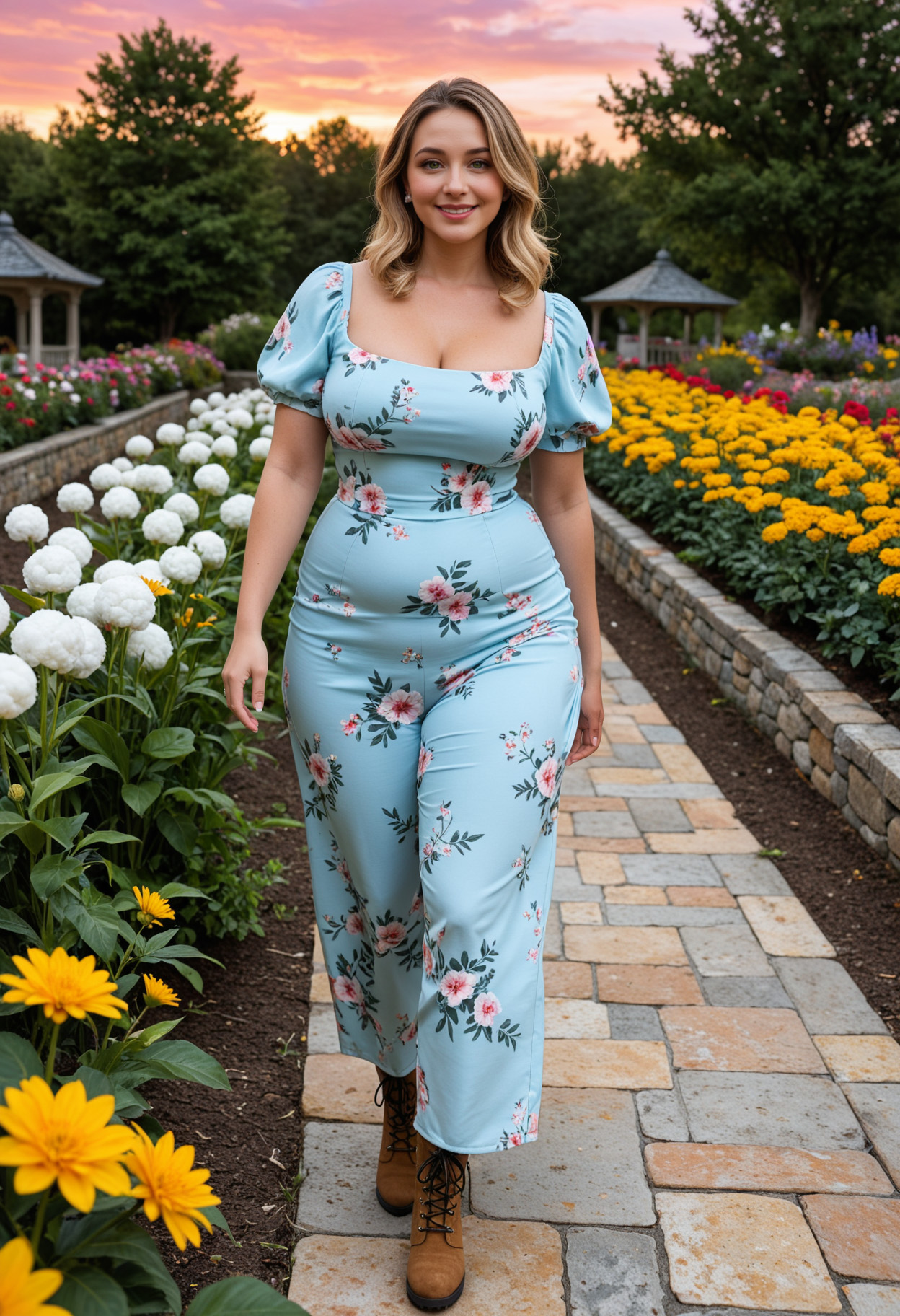 - blonde hair, blue dress, blue eyes, boots, breasts, brown footwear, brown hair, cleavage, curvy, dress, floral print, flower, full body, garden, large breasts, lips, long hair, looking at viewer, medium hair, outdoors, path, plump, realistic, shadow, short sleeves, sky, smile, solo, standing, sunset, tree, walking, white flower, yellow flower