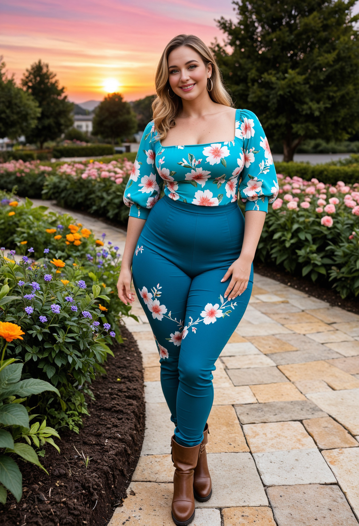 - blonde hair, blue eyes, blue pants, blue shirt, boots, breasts, brown footwear, brown hair, curvy, floral print, flower, full body, garden, large breasts, long hair, looking at viewer, outdoors, pants, pink flower, plant, purple flower, shadow, smile, solo, standing, sunset, tree