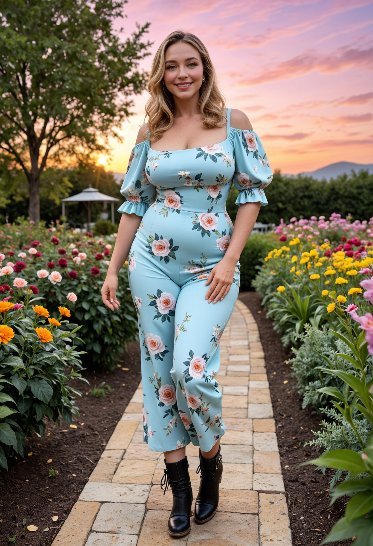 - arms at sides, black footwear, blonde hair, blue eyes, blue pants, blue shirt, boots, breasts, brown hair, bush, cleavage, clothing cutout, collarbone, earrings, floral print, flower, full body, garden, jewelry, large breasts, lips, long sleeves, looking at viewer, orange flower, outdoors, pants, path, pink flower, plant, shadow, shoulder cutout, smile, solo, standing, sunset, tree, yellow flower