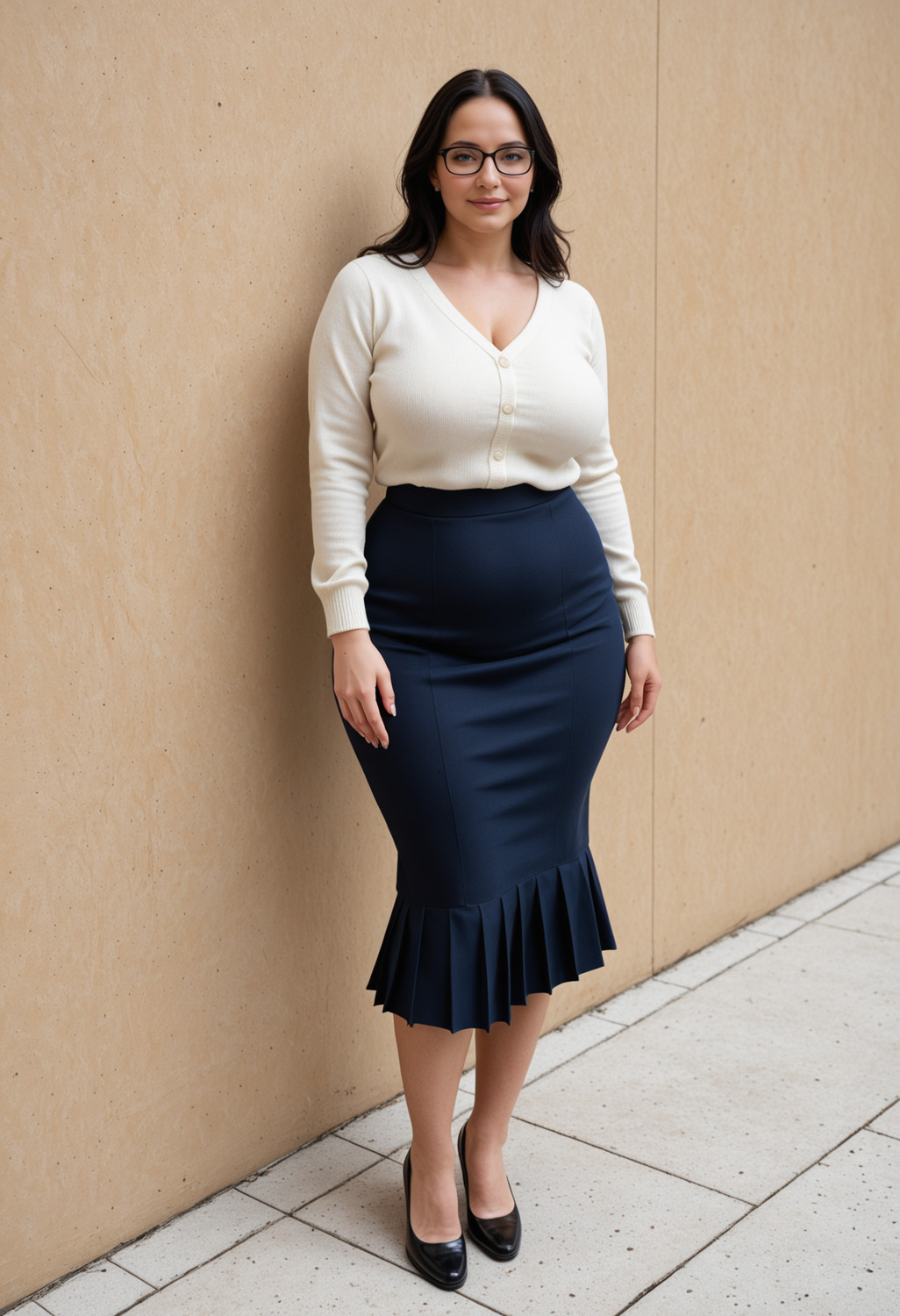 - blue eyes, blue skirt, book, breasts, brown hair, curvy, full body, glasses, high heels, high-waist skirt, holding, holding book, large breasts, lips, long hair, looking at viewer, open book, realistic, skirt, smile, solo, standing, thick thighs, thighs, white shirt, wide hips