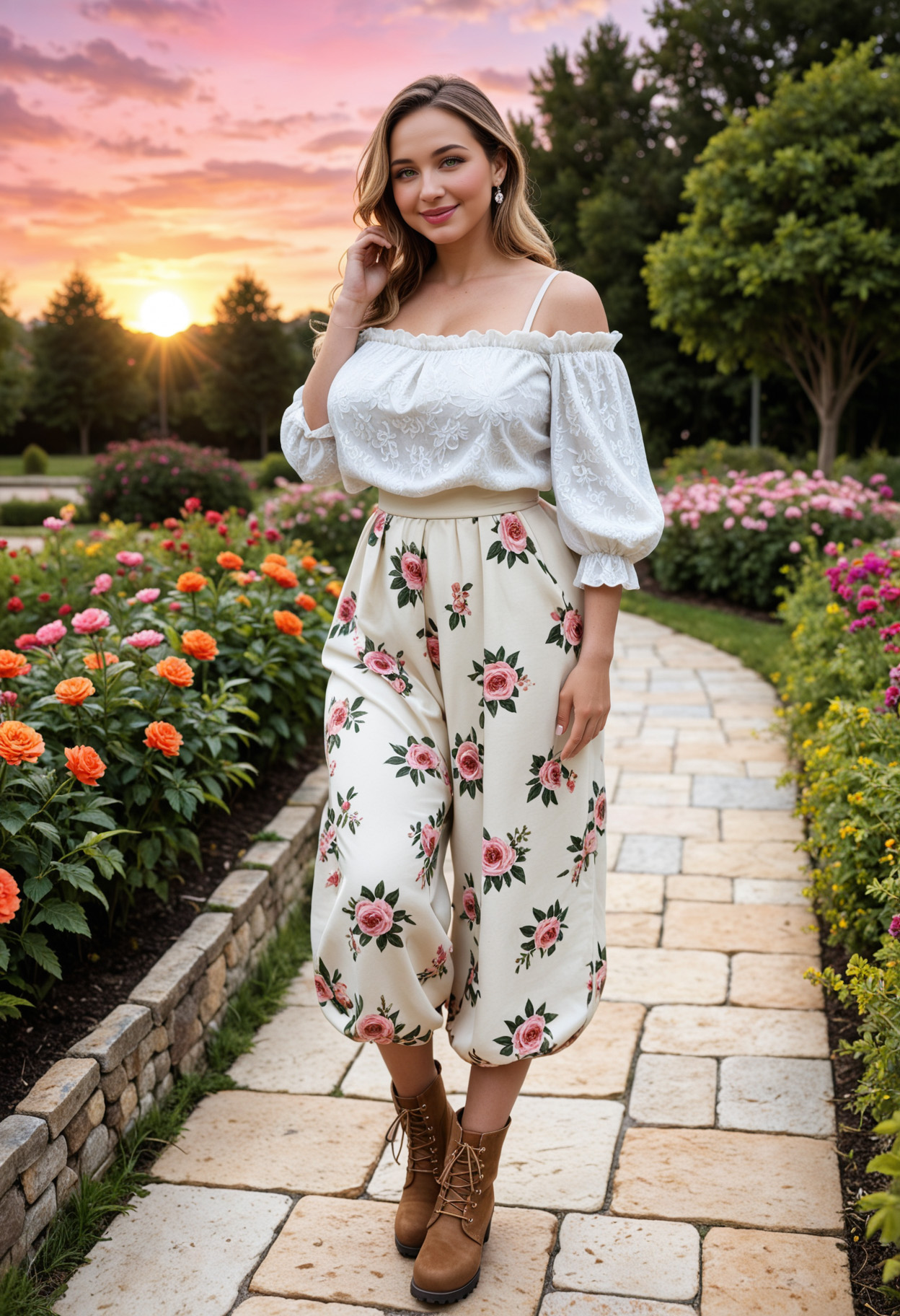 - bare shoulders, blouse, boots, breasts, brown eyes, brown footwear, brown hair, bush, earrings, floral print, flower, frilled shirt, full body, garden, jewelry, lips, long hair, long skirt, looking at viewer, multicolored hair, off shoulder, off-shoulder shirt, outdoors, pants, pink flower, skirt, sky, smile, solo, standing, sunset, tree, white shirt