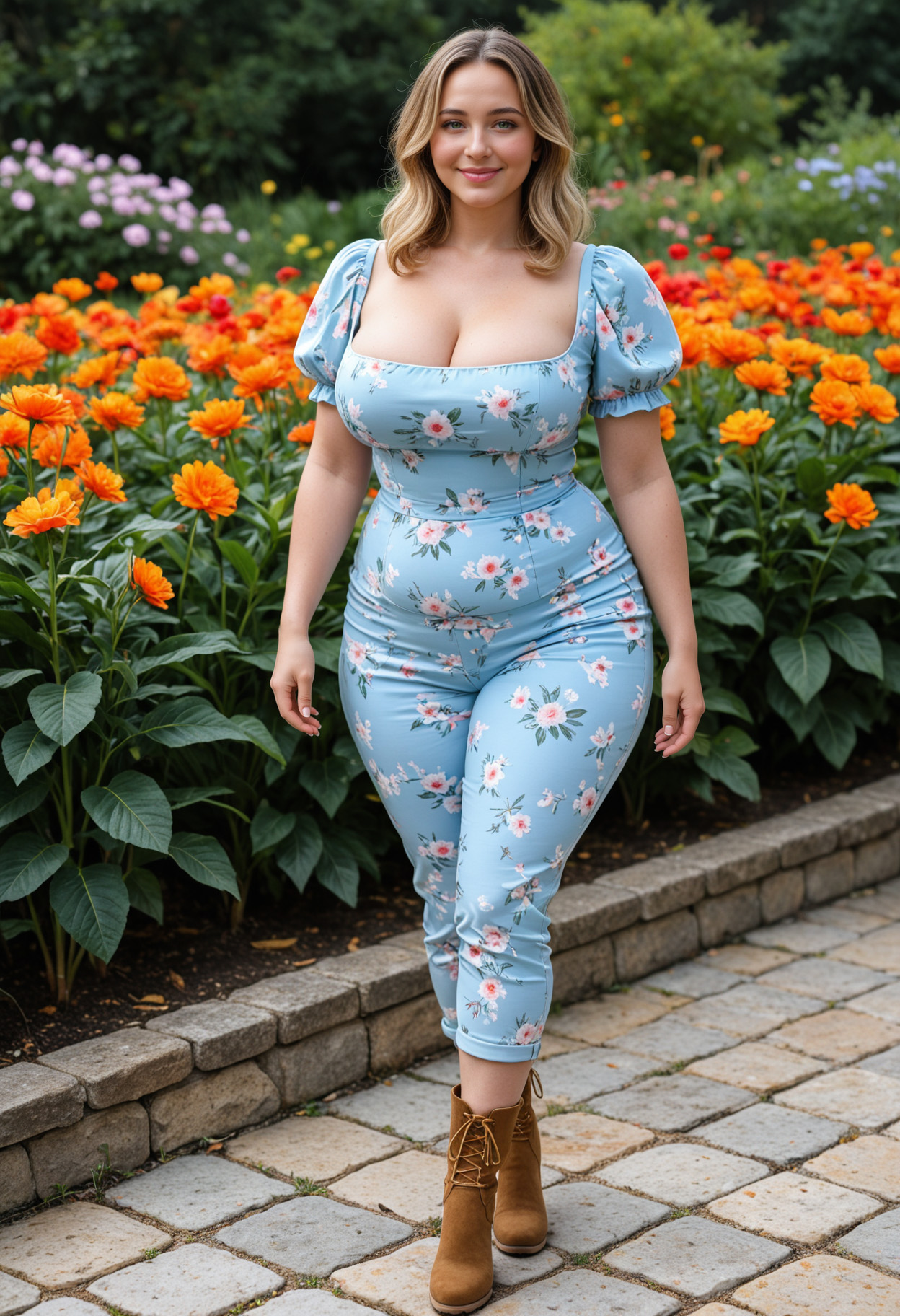 - blonde hair, blurry, blurry background, boots, breasts, brown footwear, brown hair, cleavage, curvy, dress, floral print, flower, full body, garden, huge breasts, large breasts, lips, long hair, looking at viewer, outdoors, puffy short sleeves, puffy sleeves, short sleeves, smile, solo, standing, walking