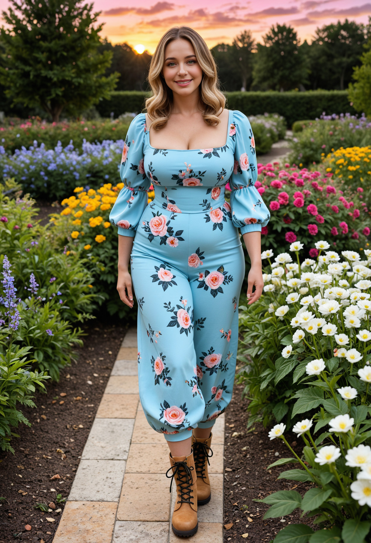 - black footwear, blonde hair, blue dress, blue eyes, boots, breasts, brown hair, bush, cleavage, cloud, collarbone, curvy, dress, earrings, floral print, flower, full body, garden, jewelry, large breasts, lips, long hair, looking at viewer, outdoors, plant, plump, puffy sleeves, short sleeves, sky, smile, solo, standing, sunset, tree, walking