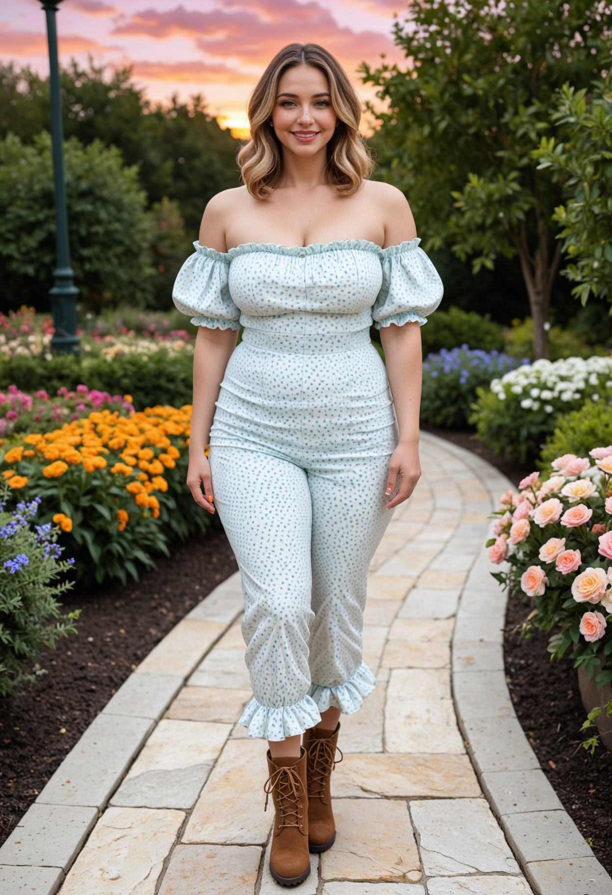 - bare shoulders, black footwear, blonde hair, blue shirt, boots, breasts, brown eyes, brown hair, cleavage, curvy, floral print, flower, full body, large breasts, lips, long hair, long sleeves, looking at viewer, multicolored hair, outdoors, plant, plump, puffy sleeves, shoulder cutout, sky, smile, solo, standing, sunset, tree, walking