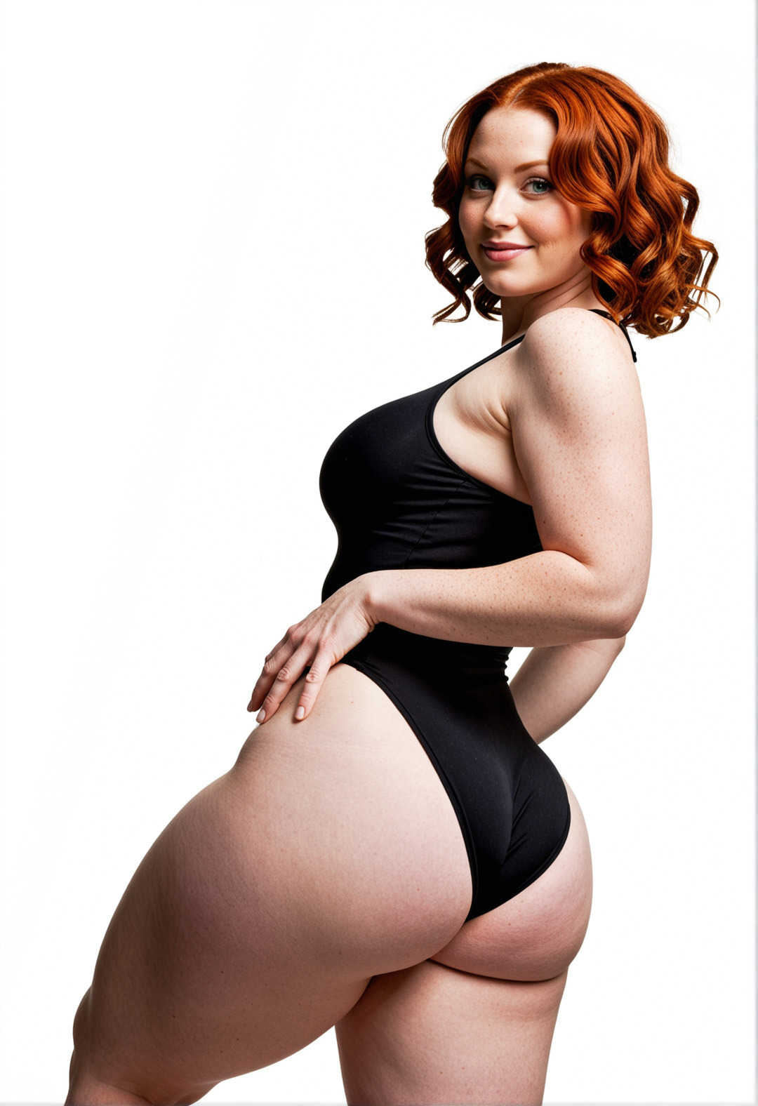 - arm up, black one-piece swimsuit, breasts, brown hair, cleavage, curly hair, freckles, hand on hip, lips, looking at viewer, one-piece swimsuit, realistic, simple background, smile, solo, thighs, white background